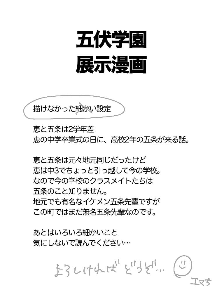 エマち☆quiet followDONE五伏学園 展示漫画①めぐみの中学卒業式の話。五は高校2年生。設定とか塗り忘れとか細かいことは目つむって読んでください… show all(+4 images) Tap to full screen (size:768x1024).Repost is prohibited Let's send reactions! freqpopularsnackothersPayment processing Replies from the creator Follow creator you care about!☆quiet follow エマちDONE五伏学園 展示漫画①めぐみの中学卒業式の話。五は高校2年生。設定とか塗り忘れとか細かいことは目つむって読んでください… 5 エマちDONE五伏学園 展示漫画②①のつづき五の高校卒業式の日の話。めぐみは他校の1年。 5 エマちDONE五伏学園 展示マンガ③みみさん(Mimice :0012)の展示作品の小説から一コマ描かせて頂きました。ぜひとも、先にみみさんの小説からお読みください(めぐみの文化祭にOBとして遊びに来た五と夏の一コマです。1ページマンガです。) エマちDONE初めて描いたマンガで拙いですが…よければ recommended works asuka27shDOODLE 4 meleDONE呪術廻戦23話ネタ。ショタ伏黒に不審者扱いされる高専五条悟(五伏?) はちくまDONEセの前後半で口数が逆転する五伏一応背後注意なのでポイピク使ってみました タケマチMOURNING絶妙にどっちでもいいものを選んでくる五と、そんなに欲求がない伏2021.4 3 shiro_pigeonDONEずっと五条と一緒に添い遂げる覚悟の恵が、このまま一生五条としか恋愛しない人生なのか?少しくらい他の人とも経験を…と思いネットで知り合った男の人と、デートしてる所を五条に見られる修羅場な五伏小説。続きはpixivに公開中♪(続きは18禁になります) 2753 n_kabosuCAN’T MAKEぽいぴく使ってみたかっただけ 7872 みお丸DONE一枚絵に、一コマ追加して、IQ3 くらいのマンガもどきにしてみたよ。 みなみMAIKING【WIP】バニーボーイめぐ まつしろ/みりんDONEごめんね!ふたりでしあわせで開催おめでとうございます!パスワードはプロフカードへ