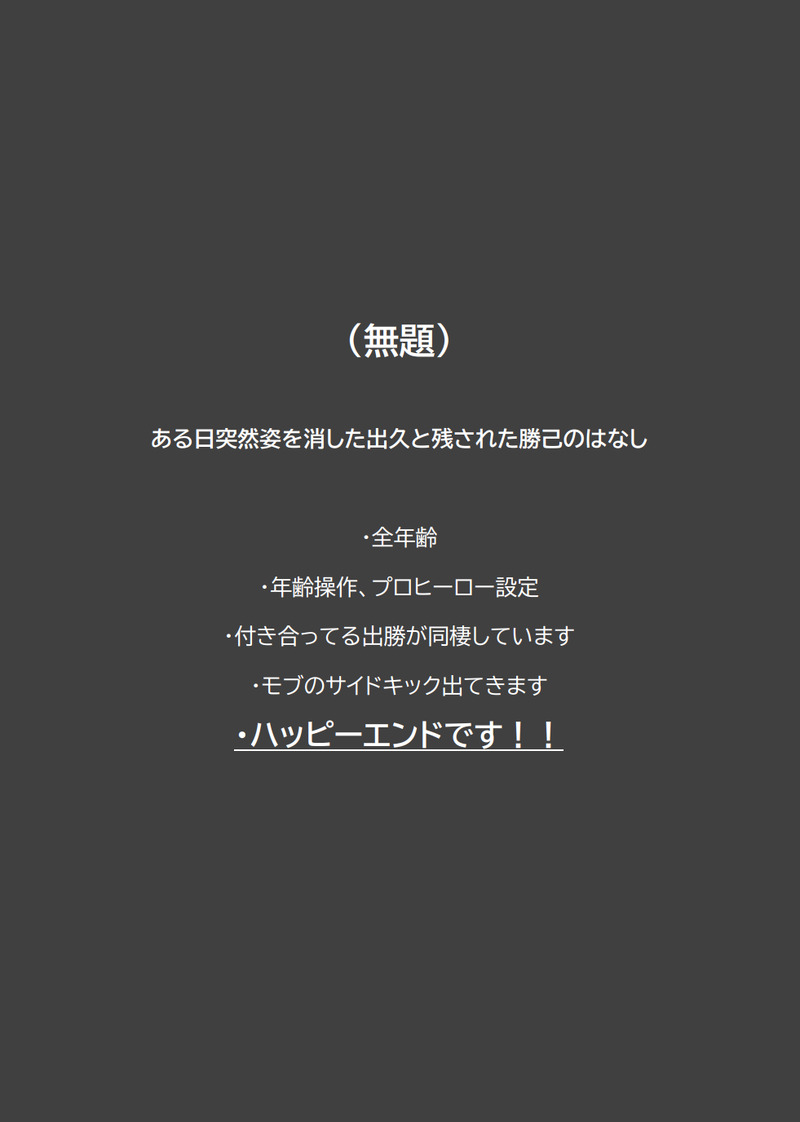 akimori☆quiet followDONE【ココデカツSS展示】1/3のココデカツ仮開催でも展示していた短いお話です。注意書きは本文一ページ目を必ずお読みください。 #出勝 izukatsu #ココデカツ cocoDécats show all(+10 images) Tap to full screen (size:981x1376).Repost is prohibited Let's send reactions! freqpopularsnackothersPayment processing Replies from the creator Follow creator you care about!☆quiet follow akimoriDOODLE7/23(日)にkotaさん(@hen_182b)と出勝イメソンについてのもくりをしたときの議事録です!二人のおすすめのイメソンを画像メモしています。※プロヒーロー設定、ハロウィンパロ、女体化など含みますのでご注意ください。 4 akimoriDONE【プロポーズ大作戦】デが勝にプロポーズしようと策略を練るけれど……という話。6/25発行の雄英教師デ×プロヒ勝の短編集に収録予定です!=注意=・プロヒ両想い、同棲してる設定・デくんが雄英ヒーロー科教師としてプロヒ活動をしています・モブ生徒の名前出ます 11 akimoriDONE【ココデカツSS展示②】1/3のココデカツ仮開催でも展示していた短いお話です。(Twitterに載せているのと同じです)注意書きは本文一ページ目を必ずお読みください。 11 akimoriDONE【ココデカツSS展示】1/3のココデカツ仮開催でも展示していた短いお話です。注意書きは本文一ページ目を必ずお読みください。 11 related works みのるPAST出勝ワンドロ【初日の出よりも】結構気に入ってるやつ 2 みたろぉDONEファミマコラボ出勝※攻めフェラ※r18 2 TᗩᑕᕼIDOODLE出勝18?yes or no みのるTIRED昨日のワンドロ、間に合わなかったし、画力死んでるし、もういいやってなってしまった供養。出勝 uq4_bkPASTTwitterに載せてるもので出勝のだけ 6 みのるPAST出勝ワンドロ【花火】で描いたもの。デレ要素はエプロンの色のみ ko2tteDOODLEXmasッチャン💚🧡💥(出勝)えっくすくんにあげてたやつですバラバラやったのでまとめました😊 5 _345DOODLE幼馴染でクリスマスまんが。一応タグ付けましたがCP要素薄目です。 4 uq4_bkPROGRESS全身描いたことないから練習で出勝?バランスはあとでどうにかする