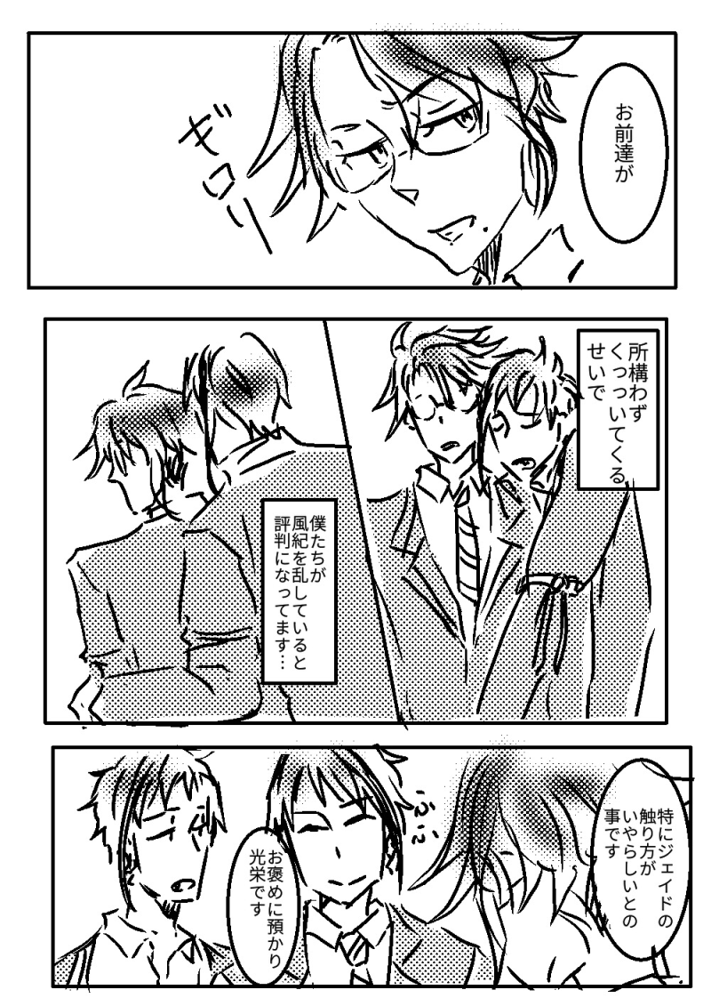モストロ・ラウンジの締め作業も終え、あと1時間もすれば日付が変わるという時刻。扉越しに入室の許可を得たジェイド・リーチは、扉を開け、すぐさま閉める。この時間帯に、アズール・アーシェングロットの私室であり寮長室である部屋に入る際に必須の仕草である。完全に扉が閉じられたのを確認したジェイドは、改めて向き直り、尻を見つけた。