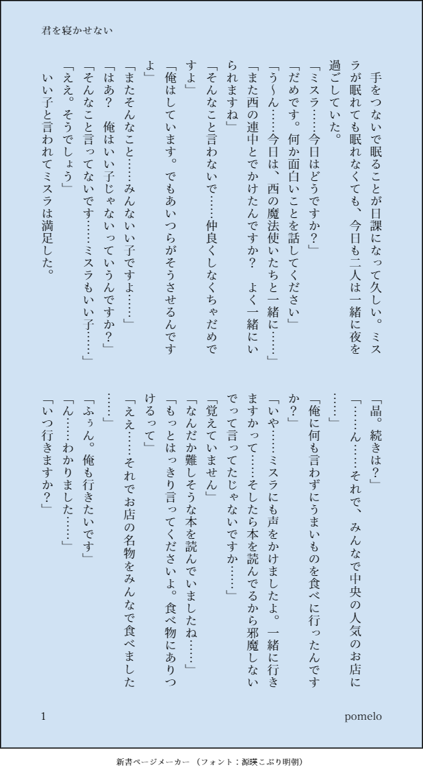 kiiromidori☆quiet followDONE晶くんオンリー5掲載小説No.3「君を寝かせない」5分で読めます。支部にも掲載しています。ベッドでのお話です。感想お待ちしております!! #ミス晶 mis-crystal show all(+4 images) Tap to full screen (size:618x1132).Repost is prohibited Let's send reactions! freqpopularsnackothersPayment processing Replies from the creator Follow creator you care about!☆quiet follow kiiromidoriDONEミス晶♂の女がゆるやかにフィガロのリアコになりそうになって書きました。フィガロに色々言いたくなって、でもしんどくて無理だったけど、ミミなら言えた。 ※晶はいません。なので、読むのに注意が必要です。 11 kiiromidoriDONE晶くんオンリー5掲載小説No.4「barter」14分で読めます。物々交換のお話です。支部にも掲載しています。1500年生きてるのに貨幣社会がまだわかってないミスラ、とてもかわいいなと思って書きました。 12 kiiromidoriDONE晶くんオンリー5掲載小説No.3「君を寝かせない」5分で読めます。支部にも掲載しています。ベッドでのお話です。感想お待ちしております!! 5 related works 真夜中DOODLEミス晶♂「賢者様…それ燃やしてもいいですか?」「やめてください」 チトセリクリDOODLE乙女向けなのに照れずに動じるだけな賢者様すき ※ミス晶♂気味注意 チトセリクリDOODLE パイナップルそばまんじゅうDOODLEミス晶♀のらくがき 5 あのアレDONEビン詰めミス晶♀。!!!晶「ちゃん」です。女です。ご注意ください!!! パイナップルそばまんじゅうMEMOmhyk ミス晶♀ 3 aoakakiir0DONE未来if。時々かいてる、まほの世界に残るのを決めた未来で眠り続けるあきらくんの話。これだけでも読めます。ただやってるだけ。 857 チトセリクリDOODLE雑な扱いに慣れたミス晶♂ キリサメDOODLEくっついてるミス晶♂がいちゃいちゃしてるだけ「あなたの名前」祝福のレガーロログスト3からの妄想 4 recommended works ごまどDOODLE『いつか、心から、 』アップしたつもりがしてなかった先生〜!!!とオマケに当時の私のツイ〜!(いらん) 2 ごまどDOODLE今年もお誕生日をお祝いできて嬉しいよ〜〜〜ッッ!!;;幸せの雨が降り注ぐように願いをこめて…フィガロ、今年もお誕生日おめでとうございます!出会えて幸せです!!! imu_0_sosakuDONEミス晶♂Twitterにあげてた晶くんウィークリーのお題「猫みたい」の小説です。 8064 wasui_awira119DONE2022.1.23.Sunピクスク開催北師弟WebオンリーHAPPY北師弟DAY開催おめでとうございます🎉スペース:氷 い5新作展示:ステンドグラス【オズ+フィガロ】パスワードは会場リンク先にて公開中です良かったら感想ください! 1342 wasui_awira119DONE2022.1.23.Sunピクスク開催北師弟WebオンリーHAPPY北師弟DAY開催おめでとうございます🎉スペース:氷 い5新作展示:燃える空【北師弟+チレッタ】パスワードは会場リンク先にて公開中です良かったら感想ください! 1753 ミナツDONEカイオエ 🧸🤍める🛌🌙DOODLE現パロは周りの目気にせずイチャイチャできて最高だな 🧸🤍める🛌🌙DOODLE aoakakiir0DONE未来if。時々かいてる、まほの世界に残るのを決めた未来で眠り続けるあきらくんの話。これだけでも読めます。ただやってるだけ。 857
