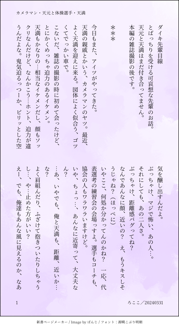Lococo☆quiet followDONE📸マン💎サンと🤸♀️選手🏅🤸♀️のダイキ先輩のモブ目線シリーズ①イケメンに脅され睨ませ散々なダイキ先輩この頃はまだ💎🏅付き合ってませんが両片思いです😆 show all(+3 images) Tap to full screen (size:618x1132).Repost is prohibited Let's send reactions! freqpopularsnackothersPayment processing Replies from the creator Follow creator you care about!☆quiet follow LococoDONE💎🏅です(お好きな方のみどうぞ)💋の日だいぶ遅刻です😓前回のダイキ先輩のお話のその後ですが読まなくても平気です🤣 6 LococoDONE💎🏅のお話・番外編😆ダイキ先輩が珍しく💎サンに褒められるお話🤸♀️大会を初めて観戦して思いついた超くだらないネタでスミマセン💦 6 LococoDONE💎🏅(DD💎&DC🏅)お好きな方のみどうぞ💖💎サンが📸マンになる前の、🏅キュンがようやく💎サンを意識しだしたお話。💎サンはずっと片思い中😂やっつけ感凄くてスミマセン💦 6 LococoDONE📸マン💎と🤸♀️🏅五輪その後のイチャイチャ…🏅キュンが頑張ってフェ🍌するけど…😂なお話くやまさん🎂おめでとう㊗️第二弾🎁です❣️ 9 LococoDONE📸マンになる前のDD💎サンと🤸♀️DC🏅の将来の約束。くやまさんお誕生日🎂おめでとう㊗️🎁遅くなりスミマセン💦 8 LococoDONEアラフォー天桃のオリンピックへの道😆五輪見てるとワクワクしますね💓 5