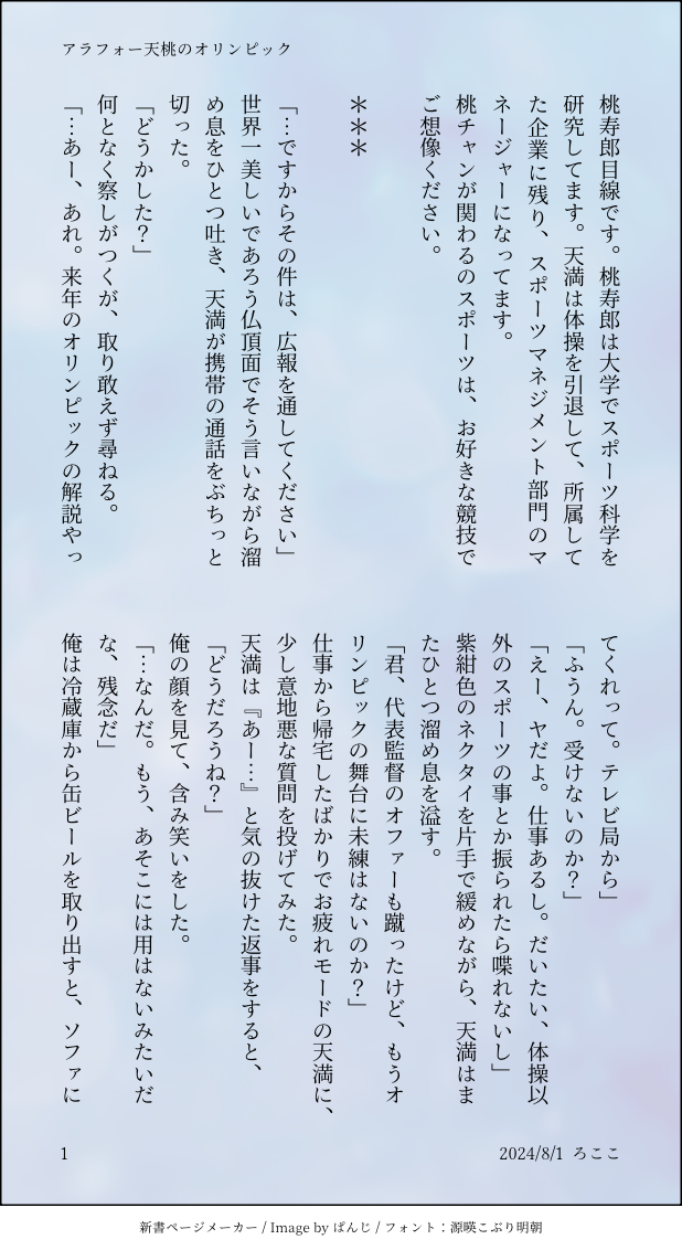 Lococo☆quiet followDONEアラフォー天桃のオリンピックへの道😆五輪見てるとワクワクしますね💓 show all(+4 images) Tap to full screen (size:618x1132).Repost is prohibited Let's send reactions! freqpopularsnackothersPayment processing Replies from the creator Follow creator you care about!☆quiet follow LococoDONE💎🏅です(お好きな方のみどうぞ)💋の日だいぶ遅刻です😓前回のダイキ先輩のお話のその後ですが読まなくても平気です🤣 6 LococoDONE💎🏅のお話・番外編😆ダイキ先輩が珍しく💎サンに褒められるお話🤸♀️大会を初めて観戦して思いついた超くだらないネタでスミマセン💦 6 LococoDONE💎🏅(DD💎&DC🏅)お好きな方のみどうぞ💖💎サンが📸マンになる前の、🏅キュンがようやく💎サンを意識しだしたお話。💎サンはずっと片思い中😂やっつけ感凄くてスミマセン💦 6 LococoDONE📸マン💎と🤸♀️🏅五輪その後のイチャイチャ…🏅キュンが頑張ってフェ🍌するけど…😂なお話くやまさん🎂おめでとう㊗️第二弾🎁です❣️ 9 LococoDONE📸マンになる前のDD💎サンと🤸♀️DC🏅の将来の約束。くやまさんお誕生日🎂おめでとう㊗️🎁遅くなりスミマセン💦 8 LococoDONEアラフォー天桃のオリンピックへの道😆五輪見てるとワクワクしますね💓 5 recommended works tenseinowDONE鳥目の影片のみか宗まんがの続き。今回もまた興が乗って、余ったレースでお揃いのアンダーウェアを作っているという脳内設定で描きました。 2 チヂミ飴DONEDSエラメア+クロスついでに最後は供養絵 5 dummychan__SPOILER hako_plugINFO卓報告〔CoC 6th〕 ROOM CERF関係者各位に敬意と感謝 cd0213mDONEあけましておめでとうございます。 yosora_PROGRESS『戴冠式』頑張って描いたけど、色塗れるかわかんないからとりあえず… 雪風(ゆきかぜ)。DONE素材はこちらからお借りしました ありがとうございます!https://commons.nicovideo.jp/works/nc2910279話の、太陽に加勢する翠くんがかっこよくて好き。 やもりDONE2025年あけおめ絵 Asagohan_osushiDOODLEラプクォげんみ❌アクナイパロお便乗 2