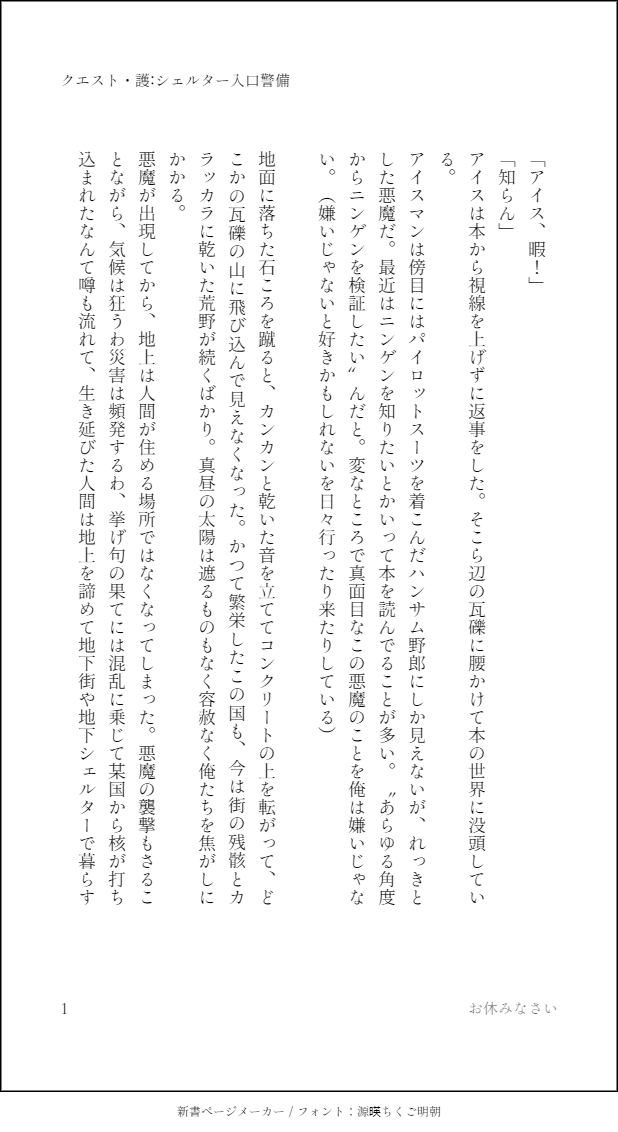 H8S1c19862022☆quiet followDONE2.クエスト・護:シェルター入口警備悪魔アイス×人外ハンターマヴェのほのぼの話です。クエスト・悪魔の巣を~のゆるやかな続きで、アイスマンをアイス呼びするくらいには仲良くなっています。PWはサークルスペースの床に書いてあります #Icemav #そこそこあぶ空1210 #アイマヴェ #アイマヴェ imavais show hide show all(+8 images) Tap to full screen (size:618x1132).Repost is prohibited Let's send reactions! freqpopularsnackothersPayment processing Replies from the creator Follow creator you care about!☆quiet follow H8S1c19862022DONE4/9のムパラおよびあぶ空で頒布予定本の見本です。マーヴェリック中心オールキャラ本で、いろんなゲームのパロディをいれた攻略本の体裁をとっています。 11 H8S1c19862022DONE3.クエスト・身体を捧げよクエスト・護:シェルター~の続きです。契約満了時期がやってきたアイマヴェです。軽いゴア表現あります。PWはサークルスペースの床に書いてあります。 10 H8S1c19862022DONE2.クエスト・護:シェルター入口警備悪魔アイス×人外ハンターマヴェのほのぼの話です。クエスト・悪魔の巣を~のゆるやかな続きで、アイスマンをアイス呼びするくらいには仲良くなっています。PWはサークルスペースの床に書いてあります 9 H8S1c19862022DONE1.クエスト・悪魔の巣を駆除してくれ悪魔アイスと人外ハンターマーヴの出会いの話です。https://twitter.com/H8S1c19862022/status/1590284875629998082こちらのツイートをもとにしたメガテン4パロのアイマヴェです。メガテン4成分は薄いですが、元ネタがわからなくても読めるようになっています。PWはサークルスペースの床に記載あります。 12 related works H8S1c19862022DONE3.クエスト・身体を捧げよクエスト・護:シェルター~の続きです。契約満了時期がやってきたアイマヴェです。軽いゴア表現あります。PWはサークルスペースの床に書いてあります。 10 H8S1c19862022DONE2.クエスト・護:シェルター入口警備悪魔アイス×人外ハンターマヴェのほのぼの話です。クエスト・悪魔の巣を~のゆるやかな続きで、アイスマンをアイス呼びするくらいには仲良くなっています。PWはサークルスペースの床に書いてあります 9 薄氷(うすらい)DONE絶対だよ。(アイマヴェ&子ルス→マヴェ)例の英字+例の数字(6文字) 3 H8S1c19862022DONE1.クエスト・悪魔の巣を駆除してくれ悪魔アイスと人外ハンターマーヴの出会いの話です。https://twitter.com/H8S1c19862022/status/1590284875629998082こちらのツイートをもとにしたメガテン4パロのアイマヴェです。メガテン4成分は薄いですが、元ネタがわからなくても読めるようになっています。PWはサークルスペースの床に記載あります。 12 recommended works ITHK_IMOKMEMOMavCyc 1208 mollyDOODLEハン👩(ボブハン軸)baby on boardされてるハン👩その内描きたい MASAKI_NDONETGMルスハン成立後ボブとハンでボーイズトーク 5193 M(タガクラ)DONE🐺を勘違いしていた🧊 4 nicedaybuckyDONEInspired by @floydsin‘s fic [explicit] https://archiveofourown.org/works/41204112 2 wolflock7PASTMy beloved wingman. wolflock7PAST青い空にはきっと良く映える カリフラワーMENU12/17の新刊の書き下ろし部分サンプルです。話のタイトルは『Mav or Pete』です。マーヴとピート、どっちで呼ばれたい?という軽い話。↓以下新刊の詳細↓・『Rapture』・文庫サイズ/330ページ程度・全年齢向け・900円(予定)・web再録中心、書き下ろし2本収録ご参考になれば幸いです🐓🐺本になっても変わらず低ハードルでご覧ください。 2662 カリフラワーDONEマ右ワンライ/ルスマヴェ/お題「クリスマスツリー」久々のワンライ参加で緊張しています。なんだかわけのわからない話になりましたが、ルスマヴェが二度とクリスマスを一人で過ごすことがないよう、願っています🎄 5957