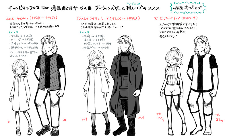 スタイルの良いエピローグスイちゃんを描こうと思ったのが発端だったと思うんですが、比較に色々並べてみたくなって増えに増えた…全話無料の波に乗って説明資料も出来た
