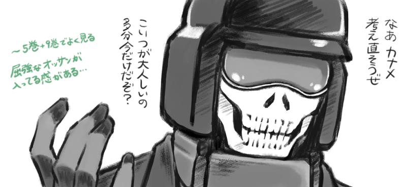 最近のお兄さんリュージと初期の髑髏マスクがいまいち結び付かないので、22巻の緩めのリュージに初期の髑髏マスク装備をさせるとどうなるかという実験(部分的にトレス)
