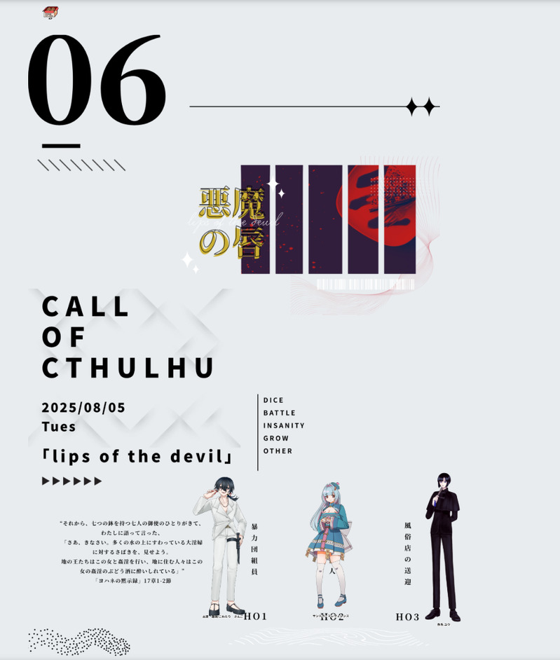 petrouchka0202☆quiet followINFO◆CoC卓報告『悪魔の唇』KP:宮さんHO1:古渡 珊瑚/ヨウカズさんHO2:サンドラ・マレヴォレンス/花畑さんHO3:魚名ユウ/きさらぎ駅前Result……END-C 全生還💋 Tap to full screen (size:914x1077).Repost is prohibited Let's send reactions! freqpopularsnackothersPayment processing Replies from the creator Follow creator you care about!☆quiet follow petrouchka0202INFO◆CoC卓報告『灰になってよかった』KP:きさらぎ駅前PC/PL:鳥谷 駿/みつすけさんResult……END-5 PC・KPC両生還🪷 petrouchka0202INFO◆CoC卓報告『REFLECTIONS OF A BROKEN SWAN』KP:YukkaさんHO1:アルベラーダ・クライスト/きさらぎ駅前HO2:マルギット・ケスラー/りんずさんResult……1生還1ロスト🦢🪞 petrouchka0202INFO◆CoC卓報告『盲目的な献花たち』KP:きさらぎ駅前HO1:南 朱雀/灘倉さんHO2:春上 七四樹/やなぎさんHO3:夏木 穂/褪雪さんResult……全生還💐 petrouchka0202INFO◆CoC卓報告『紅ゐ女』KP:きさらぎ駅前PC/PL:若生 博匡/渾沌さんResult:探索者生還🌹 petrouchka0202INFO◆CoC卓報告『凍土への憧憬』KP/KPC:宮さん/竺ヶ野 琴子PL/PC:きさらぎ駅前/魚名 ユウResult:END-1 両生還❄️ petrouchka0202INFO◆CoC卓報告『願うは秘曲、待つは魔睡』KP:きさらぎ駅前HO1:百恋 麻綾/夏鼠さんHO2:三門 周/すうさんResult:END-1 両生還📖 recommended works 畑耕しマンDOODLE🌙🐰兄弟パロ兄🐰(大学)←弟🌙(高校)フォロワー様の設定をお借りした三次創作です 4 ひのちDONE #宇受バニー強化週間👯♀️強化週間、29日までセンiシチiブはポイに掲載します!👯♀️💎さんです。かなり肌i露出iしてるのでダメな人は回れ右で⚠️合言葉はいつもの!18以上、Y or N? 3 hypnosisrabbitDONE⚠️🐴&👻🐴×🐰の3P⚠️🐰がきもちよくてあたまばかになっちゃってます⚠️なんでも許せる人むけ 3 見縞みおDONE re_i_touINFO第二話「盛夏、命は死す」 ✧END✧8日目セーブ二話………ニワァ…………ちょ、ちょそやって……………………(息切れ) 朔乃【裏の塵】DONE冬芽が男って脳が理解してくれない mikasoINFO新刊のBOOTH通販開始は2025/1/12以降になります、しばらくお待ちください! 7 🩵🩵🩵DOODLE🦋⏳ 2 Puppy BoneDOODLE《狗吠》11 22