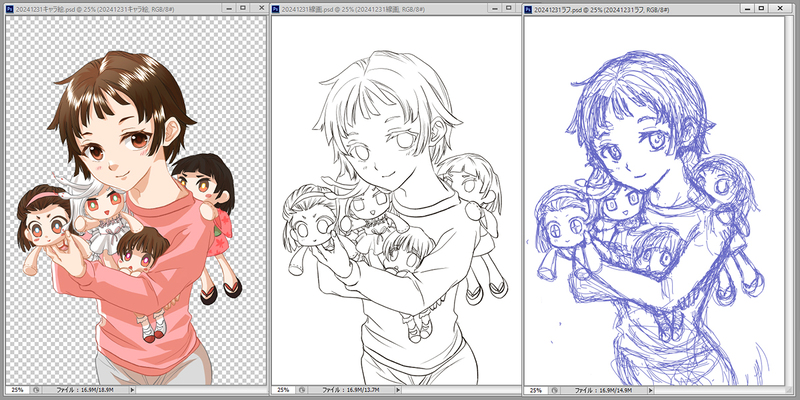 前はラフ→下描き→ペン入れ→色塗りだったんだけど、「ラフやってるのに下描きめんどい!」となった結果、ラフ絵レイヤーに直接線を重ねて描き込んでを繰り返して下描きの絵(ペン入れする線を決める所)まで持っていく方が楽だと気付いた。やり方模索中…