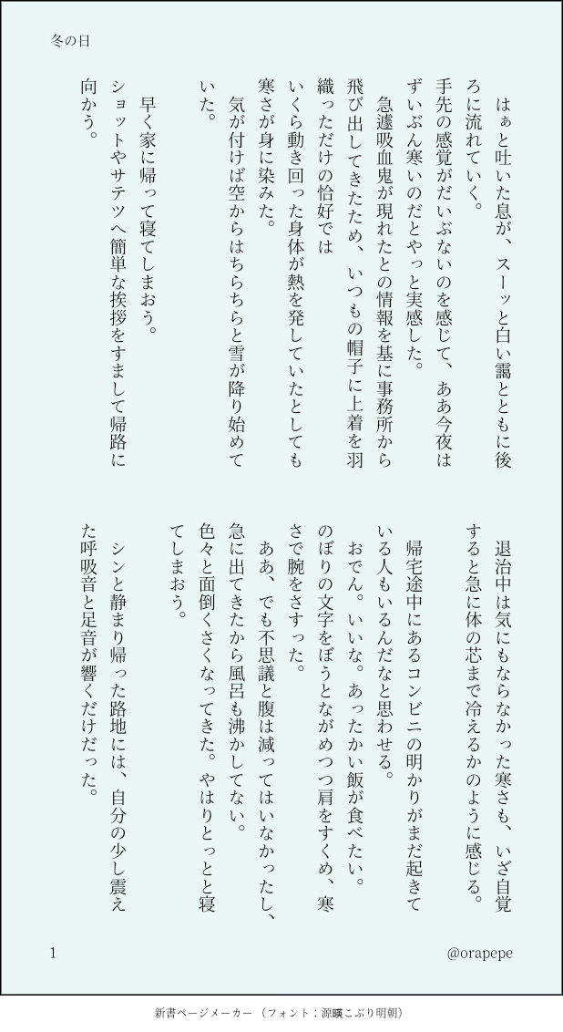 みっかん☆quiet followDONE温かいご飯が待ってるっていいよね。一人暮らしの感覚がまだ抜けてないロナルド君の冬の日の話※小説になります #吸死 Kyuushi show all(+3 images) Tap to full screen (size:618x1132).Repost is prohibited Let's send reactions! freqpopularsnackothersPayment processing Replies from the creator Follow creator you care about!☆quiet follow みっかんDOODLE♡ミツモトダイア♡らぶ♡ 2 みっかんDOODLE利土メインまとめ1(利天、土利少し有) 6 みっかんDOODLE🥷🥚まとめ1(土と利。らくがき含む) 4 みっかんDOODLEゲタ水「所有権」 みっかんDOODLEラー博コラボのロナ君 みっかんDOODLEゲタ水もらい火 related works th/tomoe@94MEMO【折り方】オリガミマジロのジョン!ネップリしていただいた皆様&本をお求めいただいた皆様、有難うございます!基本の折り方は「紙風船」です。お楽しみいただけますと幸いです🍀なお「オリガミマジロ折れたよ!」のご報告をいただけますと、作者が狂喜乱舞し、自律神経が整い、冷え性が改善し、次の原稿が光の速さで進みます。宜しくお願いいたします。ご報告はこちら→ @th_output 17 大沼京子DONEすっぴんでラフな格好でゴロゴロスマホいじってリラックスしてるマナーくん吸死キャラ、彼ばかり描いてるな私… オサハタREHABILIゲームばっかりしててお絵描きしてなかったから全然思ったように描けんくなってて苦笑いですね ゆきなり@🔰幸成DONEくらいところで光る!ロナルドパジャマ!…を着る半田。 2 umashio_oooDONE投稿テストジョナルド uqi_coDOODLE独り寝のさみしさを紛らわせる受マナーくん。 2 michika92313MOURNING #肋骨ブラウス をドラドラちゃんに着せたい欲が高まりすぎて、描いた一枚です。使用規約だと、ブラウスの作者様は支部への公開は許可されてなさそうでしたので、こちらにこっそり供養・・・;(ついったのははるか下流に流れましたwww) 18732mitsuoDOODLE微エロのドラヒナ kagonmasanDOODLE #ロナルド#吸死#アナログ#ポーズトレス黙ってりゃイケメンなのに、非モテムーブかますとこがかわいいwww recommended works 黒のポーンDOODLE祝アニメ化 ゆきなり@🔰幸成DONE子ナギリ君とまるい夢。 sunaogenkigoodDONEローとコラソン、いのちのたび建物描くのしんどかった。 三上空太DOODLEノースディン(吸死) 雲鏡静清DONE寺山修司 汽車見送る側 鰐 彦 お じ さ ん。DOODLEロナ君 matsusakadonDONEロナルド髪型の練習絵(難しい)。 ボク㌨DOODLE👹節分の日🥜 マナー違反くん fg_ouwDOODLEらくがき〜〜