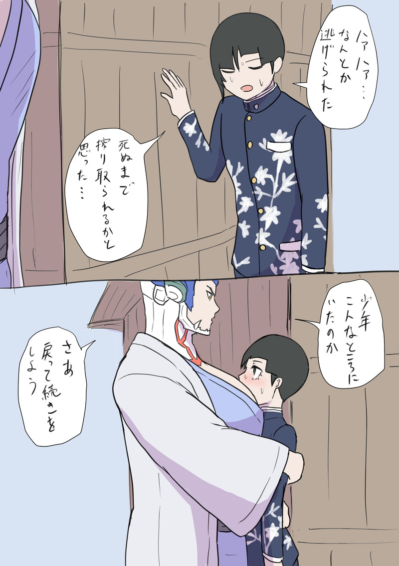 不安に思っているとよく聞き慣れた声がして振り返る。そこにはやけに胸元のはだけた着物姿のアオガミがいて、少年はいつもと違う姿に戸惑いながらも見知らぬ場所への心細さには勝てず駆け寄った。ギュッと抱きつけば柔らかな肌と甘いミルクのような匂いに包まれる。そこだけはいつもと変わらぬアオガミに少年は安堵した。