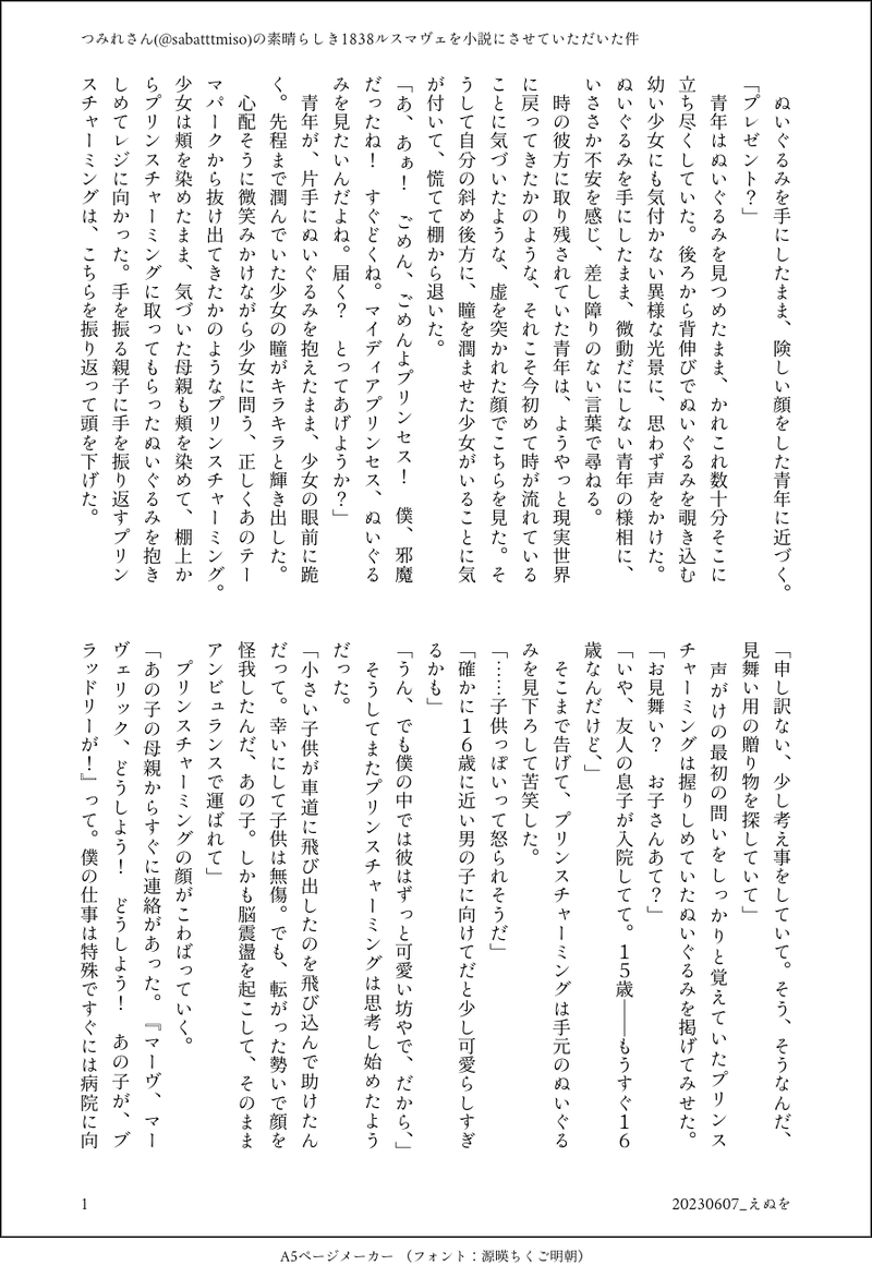 えぬを☆quiet followDONEつみれさんの1838ルマが大好きすぎてお話しを書かせていただきました。つみれさんの素晴らしい過去のルとマのイメージを壊してしまったら申し訳ありません💦パスワード:🐔🐺機体番号(数字5つ) show hide show all(+4 images) Tap to full screen (size:888x1300).Repost is prohibited Let's send reactions! freqpopularsnackothersPayment processing Replies from the creator Follow creator you care about!☆quiet follow えぬをDONE中の人での三次?創作です。シークレットサービスなtlと大統領なtmの映画があったらいいな〜の妄想。なんでも読みます食べますどんと来いな方向け。pass:英字3字+中の人の誕生月日続けて(合計11字) 5 えぬをDONEブロウジョブ飲むdsさんのjwds小話胸元オープンしすぎ中の人のお写真から、あれdsさんにも着てほしいな、と。 6 えぬをDONEjwds成人向小話正常位でしたいjwと恥ずかしくて死にそうなdsさんとの甘めの話pass18歳以上ですか?(y/n)+年齢差(計5字) 5 えぬをPROGRESS怪物に沼ヒュンしましたjwds馴れ初め小話、鋭意創作中です書き終えたら本にできたらいいな、の、巡る季節を一緒に過ごして色々を育んでいくjwとdsのお話です 33 えぬをDONEjwdsで十二国記パロなんでもOKな方向けです 5 えぬをDONE沼ヒュンした怪物jwds小話。成立前のような、それでいて矢印が双方向に強めなjwds。沼りたての勢いで書きました。 6 recommended works 1230_2013DOODLE♀マヴのルスマヴェ♀成立後、慌てて下着買いに行くのマーヴかわいいよね!なぜなアイスとサラと買いに行くけどね。書きたいとこだけ書いた 2106 カリフラワーDONEルス→マヴェの話ですが、ルスは出てきません。マーヴとフェニとボブ3人が出てきます。起承転結の見えないくらい稚拙でゆるいです。何も考えたくない時にどうぞ…笑『休憩中の些細な話』 26 カリフラワーDONEルスマヴェですが、なぜかハン目線です🐓🐺マ右ワンライ企画のために書いた過去作で、お題は「お酒」です。可愛いルスマヴェとそれを観察する冷静なハンが好きです😌✨『いい子だから』 7 カリフラワーDONEルスマヴェ/お題「早朝」なんとまあ、薄い話でしょう…。毎日投稿している同棲ルマ妄想ツイート群の一つがちょうど「早朝に目が覚めた2人」の話だったので、それを限界まで薄〜く引き伸ばして書きました🐓🐺段落字下げが出来ず読みづらいです、すみません… 4099 nonoji_2jiDONEルスマヴェまとめ 22 蘭彗☆DONESpain trip読む方向:左→右ブラッドリーくん大学でスペイン語学んだらしいから二人でスペイン旅行してほしい(*´ω`*) カリフラワーDONEルスマヴェ/お題「長い夜」離れて暮らす2人。ルスが電話越しにマーヴと夜を過ごそうとする薄い話です🐓📱🐺いつものこととはいえ、回を重ねるごとに薄くなっている気がします…🥲(やはり段落字下げができず読みづらいです、すみません…) 3834 カリフラワーDONEマ右ワンライ/ルスマヴェ前提のルス→マヴェ/お題「熱」マーヴに熱を上げるルスが書きたかったのに、ノープランで書き始めたらノープランのまま終わりました。5〜10分くらいの出来事。一応時系列は本編後間もないくらいです…✈︎ 3158 カリフラワーDONEマ右ワンライ/ルスマヴェ/お題「傘」ルスマヴェが成立する話。いつも通りゆるいです。一人で傘を差すと寂しい、そんなことに気づく二人の話☂️ 2799