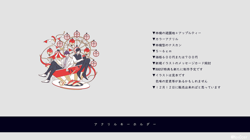 アクリルキーホルダーを制作予定です。12月12日に通販を開始出来ればと思っています。