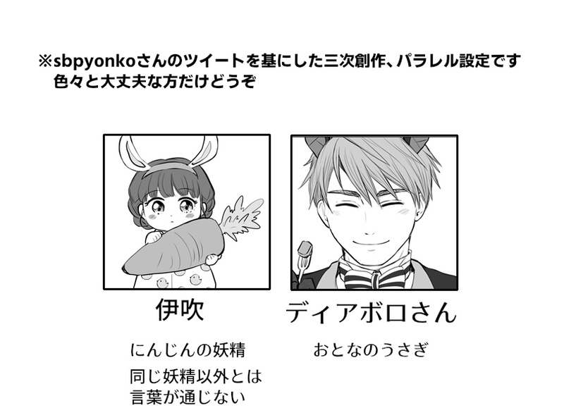 sbpyonko(@sbpyonohatake)さん案、にんじんの妖精さんを基に三次創作したらくがき漫画です。うちのMCの妖精バージョンを描いていただき、そのあまりの可愛さに妄想が止まらなくなって描いてしまいました。ご本人様より許可は頂いています。色々捏造も加えてしまったので何か問題があれば仰って下さい…!