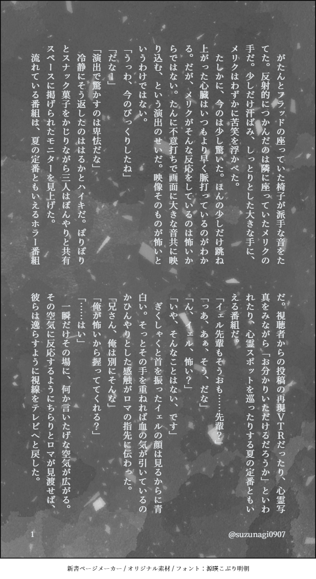 suzunagi0907☆quiet followDONE冬寮が心霊番組みてるだけ #星廻りのアステリズム asterismsInTheStarCircle show all(+5 images) Tap to full screen (size:618x1132).Repost is prohibited Let's send reactions! freqpopularsnackothersPayment processing Replies from the creator Follow creator you care about!☆quiet follow suzunagi0907DONE四鬼罪 現行未通過× 兄弟たちは〇使うかどうかわからんけども! 4 suzunagi0907TRAINING花ヶ丘 現行未通過× 自陣× R18ぽいぴくみてたら小説とか言う機能があったから試し書き。5000文字は試し書きといえるのか? 5411 suzunagi0907MOURNING花ヶ丘現行未通過✕ただの文字です 8 suzunagi0907PROGRESS本文用紙のせいで厚みが出そうだけど、この用紙、文庫本専用だからそこまで悪いやつじゃないよな……? 3 suzunagi0907MOURNINGこげぬ 現行未通過× 6 suzunagi0907DONE十二因縁 HO:午 3 related works めりのDONE【ほしあす】未来軸IFマイヤーズ双子 suzunagi0907DONE仲良し冬寮 5 suzunagi0907DONE冬寮が心霊番組みてるだけ 6 suzunagi0907DONE失恋した話。シャロレー先輩と國金さんお借り 7 suzunagi0907DONE羚メリ 3 suzunagi0907DONE文化祭フラシャロ二次創作 5 suzunagi0907DONEそれが君の幸せなら 5 suzunagi0907DONE星廻りのアステリズム山羊座と水瓶座の副寮長 6 suzunagi0907DONER18 山羊座二次創作 6 recommended works suzunagi0907DONE星廻りのアステリズム山羊座と水瓶座の副寮長 6 suzunagi0907DONE羚メリ 3 suzunagi0907DONE仲良し冬寮 5 suzunagi0907DONER18 山羊座二次創作 6 suzunagi0907DONE文化祭フラシャロ二次創作 5 suzunagi0907DONE 5 suzunagi0907DONE冬寮が心霊番組みてるだけ 6 suzunagi0907DONE失恋した話。シャロレー先輩と國金さんお借り 7 suzunagi0907DONEそれが君の幸せなら 5