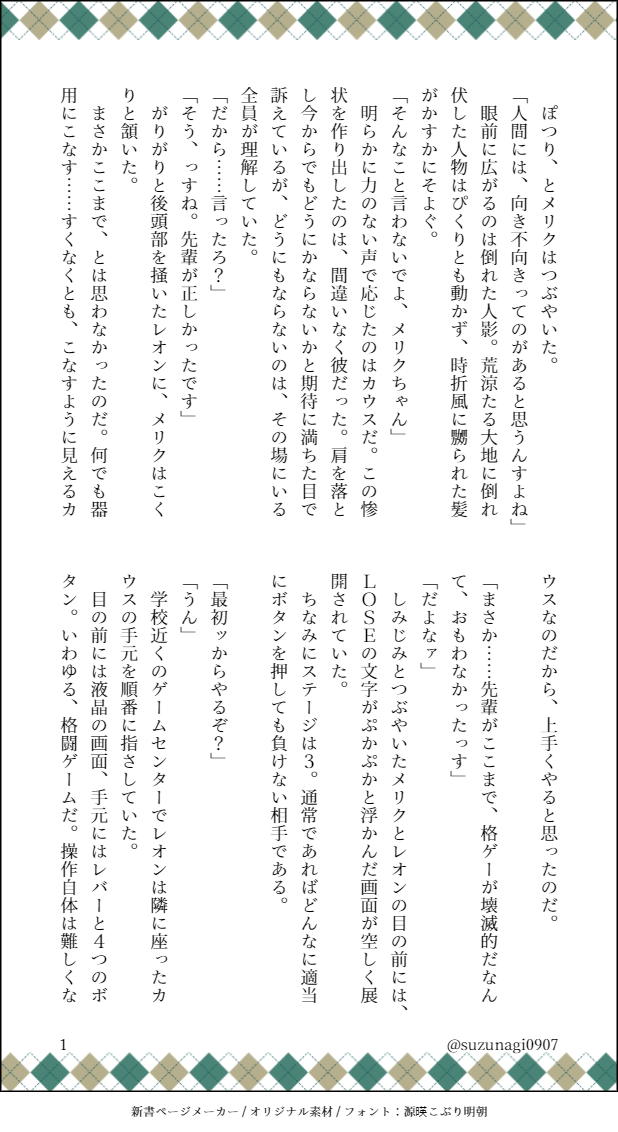 suzunagi0907☆quiet followDONE番がゲームする話 #星廻りのアステリズム asterismsInTheStarCircle show all(+6 images) Tap to full screen (size:618x1132).Repost is prohibited Let's send reactions! freqpopularsnackothersPayment processing Replies from the creator Follow creator you care about!☆quiet follow suzunagi0907DONE四鬼罪 現行未通過× 兄弟たちは〇使うかどうかわからんけども! 4 suzunagi0907TRAINING花ヶ丘 現行未通過× 自陣× R18ぽいぴくみてたら小説とか言う機能があったから試し書き。5000文字は試し書きといえるのか? 5411 suzunagi0907MOURNING花ヶ丘現行未通過✕ただの文字です 8 suzunagi0907PROGRESS本文用紙のせいで厚みが出そうだけど、この用紙、文庫本専用だからそこまで悪いやつじゃないよな……? 3 suzunagi0907MOURNINGこげぬ 現行未通過× 6 suzunagi0907DONE十二因縁 HO:午 3 related works suzunagi0907DONE羚メリ 3 suzunagi0907DONE冬寮が心霊番組みてるだけ 6 めりのDONE【ほしあす】未来軸IFマイヤーズ双子 suzunagi0907DONE星廻りのアステリズム山羊座と水瓶座の副寮長 6 suzunagi0907DONER18 山羊座二次創作 6 suzunagi0907DONE失恋した話。シャロレー先輩と國金さんお借り 7 suzunagi0907DONE文化祭フラシャロ二次創作 5 suzunagi0907DONEそれが君の幸せなら 5 suzunagi0907DONE仲良し冬寮 5 recommended works suzunagi0907DONE星廻りのアステリズム山羊座と水瓶座の副寮長 6 suzunagi0907DONE羚メリ 3 suzunagi0907DONE仲良し冬寮 5 suzunagi0907DONER18 山羊座二次創作 6 suzunagi0907DONE文化祭フラシャロ二次創作 5 suzunagi0907DONE 5 suzunagi0907DONE冬寮が心霊番組みてるだけ 6 suzunagi0907DONE失恋した話。シャロレー先輩と國金さんお借り 7 suzunagi0907DONEそれが君の幸せなら 5