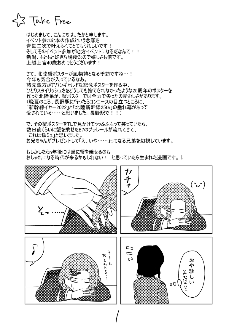 note512_it☆quiet followDONEガタケ172で無配だったペーパーです。誤字を修正しています。お手に取ってくださった方ありがとうございました!弟が本読んでるページはポイピク内のサンプル(ひとつ前の投稿)にあります。 show all(+3 images) Tap to full screen (size:2122x2976).Repost is prohibited Let's send reactions! freqpopularsnackothersPayment processing Replies from the creator Follow creator you care about!☆quiet follow note512_itDOODLE不穏な話をしてる延伸前北陸兄弟⚠️お兄ちゃんが猫です 140 note512_itPAST2022年のガタケで出していたコピー本です。北陸本線が雨で大変だったときの話。後書きで言ってる「続きの話をジュニアと敦賀で書きたい」はスパコミの新刊の構成要素となりました(小説)。それが一つ前の投稿の「未来の追憶」です。(「未来の追憶」は7/2までの公開とします) 14 note512_itPAST鉄パーミル4で展示していた信越と兄陸の話。当時お読みいただいた方ありがとうございました!(※誤字脱字の修正等少々手を入れています) 9279 note512_itDONE青の日報GW2023で配っていたペーパー②です。けーちゃんとなんぼくちゃんが大宮乗り換えで王子保に行く話でした!(王子から王子保で検索すると兄さんルートなの書き始めてから知りました)以下、後書きのような文章。◇◇◇読んでいただきありがとうございました!王子組の仲の良さ(と東海道さんの電車線と元枝線)に夢を見ています。 7716 note512_itDONE青の日報GW2023で配っていたペーパー①です!現地でお手に取ってくださった方ありがとうございました!!! 4 note512_itDONEHARU31の無配ペーパーです。会場でお手に取っていただいた方ありがとうございました!!! 4 recommended works アルビレオTRAINING後ろ姿とかの練習をしてみる。耳の角度とかが大事かなと思ってる。しかし井宿の頭の形とか短髪の表現って難しい‥。原作はそれほど写実的に描いてる訳ではないし、髪型的にリアルを追求していけば良いわけではなさそう(これは好みの問題だけど)‥。ちょうど良い加減を見つけられると良いな。もっといろんな角度を描いてみたかったけど時間切れ🙄 NaoDOODLESONIC 94 12 awaawaburoDOODLE🛩️AUまとめ。カプっぽい風南多め。3、4枚目は雑漫画なので続いてます。 14 cmerc__DONEHappy birthday, Benimaru 2 緑肌トロールPASTBlitzika、電子透かしなしを縦読みでスッキリ読みたかったので。*****作品読み終わったことを想定したコメント👇「あんたはつけた傷と生きるしか無いとしても」最初は「あんたが思い知らせた」にようと思っていましたが、シンスマスでブリッツの側にストラスが来たのでより加害者であることを強調する言葉にしました 15 のんびり終焉世界DOODLEオカルンと黒マスク君(dnddn)どっちも間違っていて、どっちも正解だった。呪行李から出た後の黒マスク君の表情の明るさを見る限り、気にしそ〜……なんて、妄想が膨らみまして。こう言う行間を深読みした"ような"(重要)妄想が大好き。 7 anonnsaklDONEわくびー ▶️夢 夢主顔有 🗝▶️誕生日4ケタ トレス素材お借りしました rkgk_zuiDOODLE🎁ガウェイン差分 2 shatiku_bDOODLEあくおのとらいろみ 3