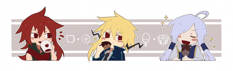 イオームはホットチョコ、レクターくんはチョコドーナツ、ヒョーガくんはチョコアイス。