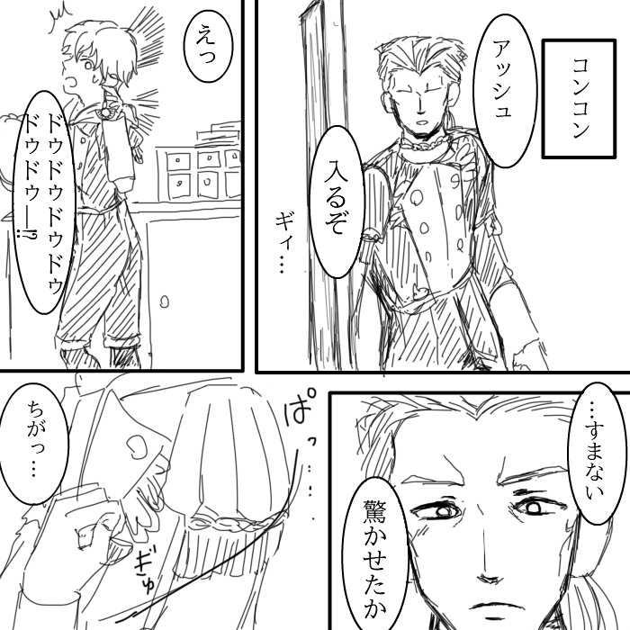 「こっそりとドゥドゥーの所持品を身につけてるアッシュとそれを目撃するドゥドゥー」