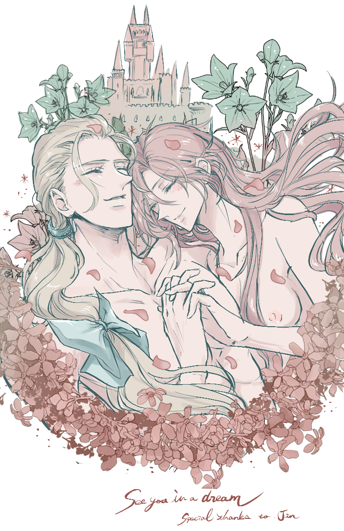 願望を叶えていただけたような気持ちで、本当にじん様に感謝です。感激のあまり幸せな眠りにつく二人の絵を描かせていただきました。キスマークは花弁で代用、乳首隠れていないのは私の趣味です(じん様にOK頂きました🙆♀️