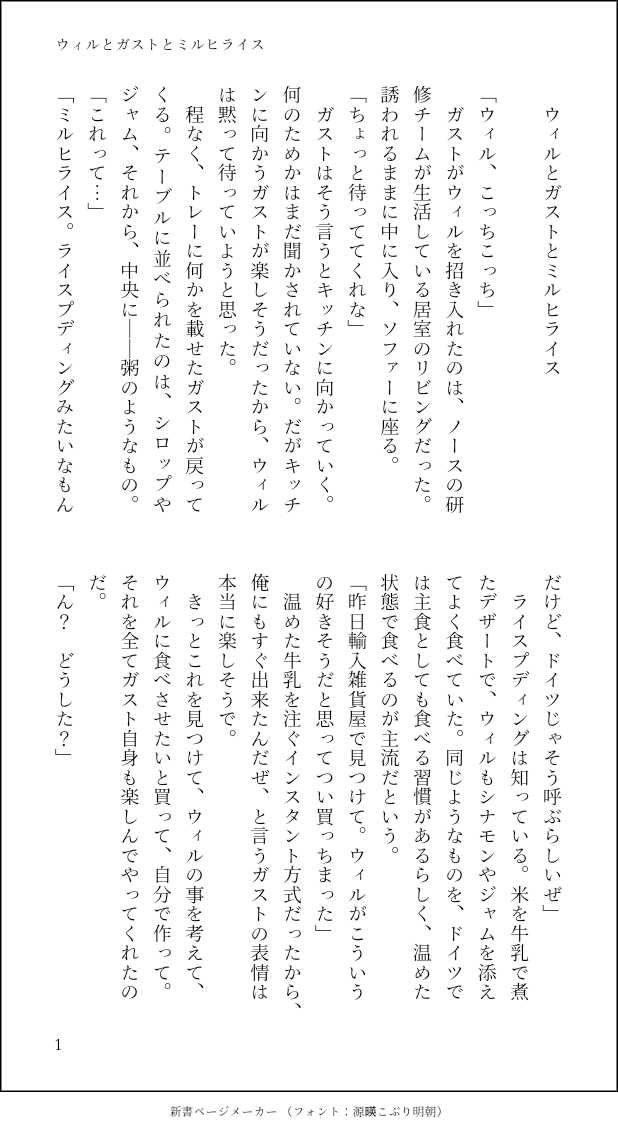 よるのなか☆quiet followMOURNINGウィルガス。ガがウィのためにミルヒライスを作る小話。先日突然ミルヒライスを思い出してウィを連想したので。ミルヒライスは10年以上前に実際に食べたことあるのですが、ライスプディングは知識でしか知らず、厳密な違いが調べきれない…でもこのシーンは書きたい…ということでポイピクに投下させてください。 #ウィルガス wilgus show all(+2 images) Tap to full screen (size:618x1132).Repost is prohibited Let's send reactions! freqpopularsnackothersPayment processing Replies from the creator Follow creator you care about!☆quiet follow よるのなかDONEキスブラwebオンリー「生真面目な君と乾杯」展示作品です。開催おめでとうございます!イベント終了しましたのでパス外しました。バーの店主キさんと客ブさんが出会うところから始まる話。パロ:ヒーロー=2:1くらいの話です。本にする予定だったため長くなりました。(本には後日する予定なのでよろしければそちらも……Xでお知らせします)※今月の給仕たち〜のイベストは未読の状態で書いております 31262 よるのなかTRAININGヴィクガスです。ガさんお誕生日おめでとう(遅刻すみません)で何故かヴィクガス(初書きですびっくり)になりました。キャンペーンページでの、ヴィクさん登場時のセリフ見てたらこれが降ってきて吐き出さずにはいられず⋯ 1611 よるのなかDONE幻想水滸伝webオンリーイベント「星の祝祭Ⅵ」のWEBアンソロ企画参加作品です。キャラ「2主人公とジョウイ」で、お題「緑」お借りしました(CPなし)ミューズ和議決裂後のどこか(設定はふわふわ適当)で、偶然二人だけで会うことになる2主とジョウイの話。ハーンとゲンカクも戦時中に酒を酌み交わしていたらしいし、二人にもそんな時があればいいのに、と想像した結果です。2主人公の名前→ミラン 2987 よるのなかDONE主坊。幻想水滸伝webオンリーイベント「星の祝祭Ⅵ」展示作品です。開催おめでとうございます!ロックアックス陥落後の主坊の会話です。CP色はそれほど強くありませんが主坊のつもりで書きました。・ティントで逃亡していない2主です。・坊ちゃん:アルト、2主:ミランタイトルは某有名バンドの曲から。これ聴くたびに主坊だと思います。 3875 よるのなかDONEキスブラキスブラワンドロワンライお題「パンケーキ」お借りしました。キッズスペースのスト内容を少しだけ含む&ちょっとキさんに対する幻覚が強めかもしれない 1590 よるのなかDONEキスブラ(のつもり)です。多分皆さんが沢山幻覚見て擦られているだろう話ですが私なりに。下記ご注意ください。・冒頭モブ女性がちょっとだけ出る・キに過去、不特定多数と関係を持っていたと仄めかす描写あり・設定ふわふわこれここからセフレみたいなのが始まるルート分岐も頭に浮かんだんですが、キさんはこっちルートを通りそうだなと個人のイメージですが。 5470 related works satsuki_chi_heDONE今更バレンタインネタなウィルガス短文。キース目線です。パスワードはお品書きにあります。 5623 __🏠DOODLE数ヶ月かけても書き上がらないので途中まででアップ。完成次第こちらは消す。※攻めの女体化(後天性)※女体化しても左右は覆らないので女攻め状態※逆リバは吐くレベルでダメな人間が書いているが配慮は自分に対してのみ※🍃のぬるいソロプレイまでで終わりPW:18↑?(y/n) 4660 ygdrsl1234DOODLEウィルガスが「しないと出られない部屋」に入れられたら ygdrsl1234DOODLEウィル→アキラ⇄レン←ガストのウィルガスR18ただ傷を舐め合う話 2510 よるのなかDOODLEウィルガス小話。といってもガストのみで、ガストがウィルを気になり始めるきっかけの話。ごめんなさいふざけたわけではない(と思う)のですが、ホリデーオーダー画面のウィルを見たら、ウィルが持ってるとうもろこしがガストだったら良いとか思ってしまったのです… 2 satsuki_chi_heDOODLEなるほどMか…と思って書いた 短いしそんなにすけべではない 769 ygdrsl1234DOODLEウィルガスの世界線での3部直前の別れ話 1816 minori_nbls 深範DONEガストさんお誕生日おめでとうございました!なエリチャンのお話。🌱🍃ですよ〜 669 helukaedePROGRESSウィルガスになる犬猿の漫画です。力尽きてしまったのでなんか犬猿が喋ってるだけです…!webオンリー開催ありがとうございますおめでとうございます~~~!! 10 recommended works ときねDONEフリートの短文です。陣章ともキスブラとも取れたやつです。 2 みぃ☆DONE第8回キスブラワンドロライお題は『年の瀬』でキースの家を大掃除する話。甘々キスブラ読み切りですが、続きっぽいものを1日と3日(R18)で書く予定。 3484 ろい。DONEキスブラwebオンリー「キスで隠したそのブラフ」展示漫画(3P)街頭に貼られたブのポスターの前でイチャついてるだけです 3 ohoshiotsukiMAIKING死神ネタでなんか書きたい…と思ってたらだいぶ時間が経っていまして…途中で何を書いているんだ…?って100回くらいなった。何でも許せる方向け。モブ?がめちゃくちゃ喋る。話的に続かないと許されないけど続き書けなかったら許