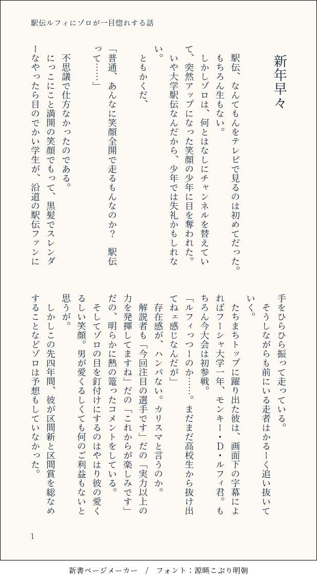 geny☆quiet followPAST⚔👒/駅伝ルフィをTVで見てにわかファンになったゾロが現地に見に行く話 #ゾロル zolu show all(+5 images) Tap to full screen (size:618x1132).Repost is prohibited Let's send reactions! freqpopularsnackothersPayment processing Replies from the creator Follow creator you care about!☆quiet follow genyMOURNINGゾロルが結腸責めエッチに挑戦する話。ひたすらアホエロです。指導医は伝電虫のトラ男先生(100パー善意)お世話になります…。何でも許せる方向け!‘23ゾルオンリーで書いた話の没版(内容は全く違いますが)供養させて下さい🙏🔑18↑? yes or no 8089 genyMOURNING【⚔👒/学パロ/ル愛され】バレンタインなゾロルは数年ぶり書きました(笑)チョコを託されるルフィの話。ゾロは気が気じゃない。 6 genyPAST⚔👒/駅伝ルフィをTVで見てにわかファンになったゾロが現地に見に行く話 6 genyDeep Desire【ゾロル/学パロ】・くっつくかくっつかないかくらいの両片想い期が大好物です!(と訴えたいだけの話)・Twilog 4 geny1111【現パロ/同棲ゾロル】・ゾロ誕おめでとう!・去年のリバイバルで申し訳ない 4 genyMOURNING【RED×ゾロル】・完全版→https://www.pixiv.net/novel/show.php?id=18337509 ・最後はこうだといいな…泣けるな…って妄想です・Twilog 4 related works ちーざDOODLE 2 ちーざDOODLEn番煎じですがゾのピアスつけてるルに夢見てます……ゾの服をちょっとはおらせてるのは趣味です。 ちーざCAN’T MAKE小舟時代の妄想ブロマンス寄りかもわかんないです 4 ちーざDOODLE坊さんと親分も良いなと…感想絵的なものはまた別に描きたい… ちーざDOODLE学パロが見て〜の波がきています ゲニーMOURNING【現パロ/同棲ゾロル】・ゾロルが猫を飼う話です・やきもちルフィ・恋人と猫のお世話が大変なゾロ氏・ヌルいけど本番ヤってるのでご注意下さい・べったーから移動しました 4242 ちーざDONE ちーざDONE麦わらチェイスのゾロルはいいぞ ちーざDONE大声でゾを呼ぶ船長いいよねという絵
