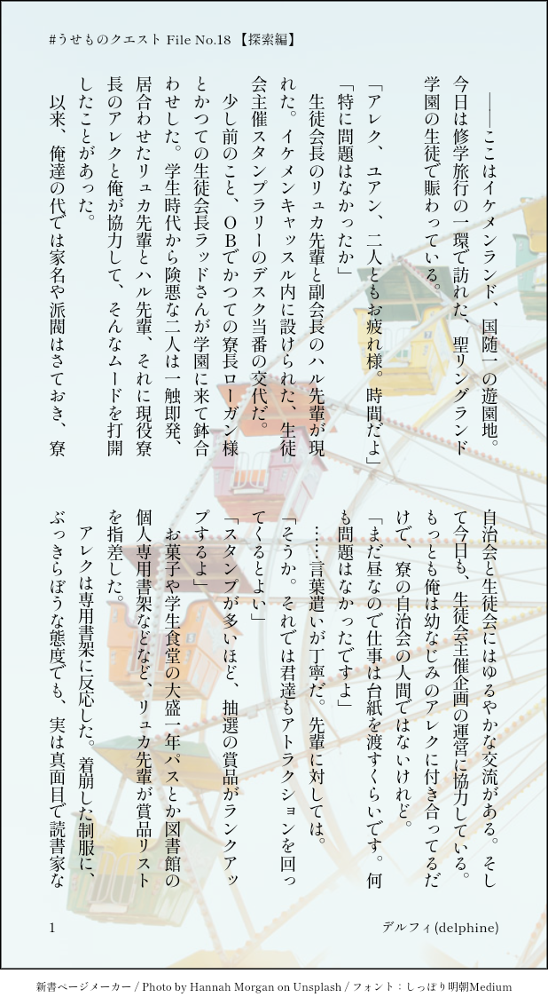 【うせものクエスト】ファイルNo.18、探索マップはイケメンランド、タイトルは夜曲です。