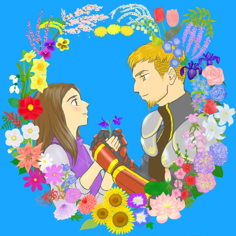 ザルバッグ×ティータでとにかく甘いのを描きたくて。じつは恋愛系以外に希望や未来といった花言葉を持つお花を多めに選んでいて、二人の運命へのせつない対比にしています…。