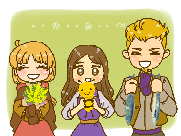 「ミモザの日よ!」「ミツバチの日です!」「サバの日だ!」と意見がそろわない3人いいよね、と思いついたので……
