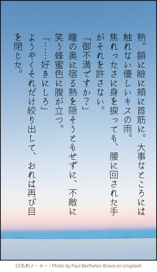 なつま☆quiet followTRAINING貴方はミタロイで『御不満ですか?』をお題にして140文字SSを書いてください。#shindanmakerhttps://shindanmaker.com/587150 Tap to full screen (size:550x950).Repost is prohibited Let's send reactions! freqpopularsnackothersPayment processing Replies from the creator Follow creator you care about!☆quiet follow なつまDOODLE 2 なつまDOODLEひなたのげこくじょう なつまDOODLEエイプリルフール用に描いた釣りサムネの全体図 なつまDONEうちのミッタマこんなんばっかだな…余裕があるようで無い攻様なんです…パスワード:18↑? 2 なつまPROGRESS 6 なつまDOODLE清楚おしとやかきらきらミタロイ描きました related works SasameREHABILIあなたは細雪んちの獠香で【噛んで微笑ってもう一度キス / あれは嘘だった】をお題にして140字SSを書いてください。#shindanmakerhttps://t.co/FT9UR8u5Hs『血の証』を見た獠ちんからクレームがありまして「書き直せ!!」と言われちまったよ…(*꒦ິ꒳꒦ີ*)獠ちんが悪いんじゃん!! かほる(輝海)DONEシティーハンター冴羽獠×槇村香原作以上の関係かほるさんちの香で「生きる」と「地獄」のお話はどうでしょう? 5ツイート(700字)以下だと嬉しいですっ!#CHしたったー #shindanmakerhttps://shindanmaker.com/965157何か暗い感じになっちゃったけど、これで許して…(´・ω・`)この後は二人で天国へ行った(イッた?)に違いない(*´艸`*) 2 SasameREHABILIあなたは細雪んちの獠香で【噛んで微笑ってもう一度キス / あれは嘘だった】をお題にして140字SSを書いてください。#shindanmakerhttps://t.co/FT9UR8u5Hs過去最短で書いた気がする( *¯ ꒳¯*)フフン opinel432DONETSりんわかBLさんは『もしかして誘ってる?』をお題に、140字でSSを書いてください。#shindanmakerhttps://shindanmaker.com/320966 かほる(輝海)DONEシティーハンター冴羽獠×槇村香原作以上の関係書き手募集していたのでびんじょった(*´ω`*)Rさま(@ryu_wen)ありがとうございました!Rんちの冴羽くんと香で「唇」と「「ばぁか」」のお話はどうでしょう? 1ツイート(140字)程度だと嬉しいですっ!#CHしたったー #shindanmakerhttps://t.co/2IQJRYQwf0 こよみTRAININGこよみんちの獠と香で「バスタイム」と「モーニングキス」のお話はどうでしょう? 1ツイート(140字)以下だと嬉しいですっ!#CHしたったー #shindanmakerhttps://shindanmaker.com/965157ギャグ路線?😅お題の言葉は直接は使ってない😅直接表現はしてないので、全年齢。 かほる(輝海)DONEシティーハンター冴羽獠×槇村香原作以上の関係あなたはかほるさんちの香ちゃんで【癖になるかも / 行儀の悪さは艶やかさ】をお題にして140字SSを書いてください。#shindanmakerhttps://shindanmaker.com/780366これはお行儀が悪い方が萌える(*´艸`*) rick_underworldDONE貴方は🌹→☕️で『口説き落としてみせる、って』をお題にして140文字SSを書いてください。2022/12/13そう思っていたのに、#shindanmakerhttps://shindanmaker.com/587150 aosabikinakoTRAINING貴方はハル相で『最大級の口説き文句』をお題にして140文字SSを書いてください。#shindanmakerhttps://shindanmaker.com/375517