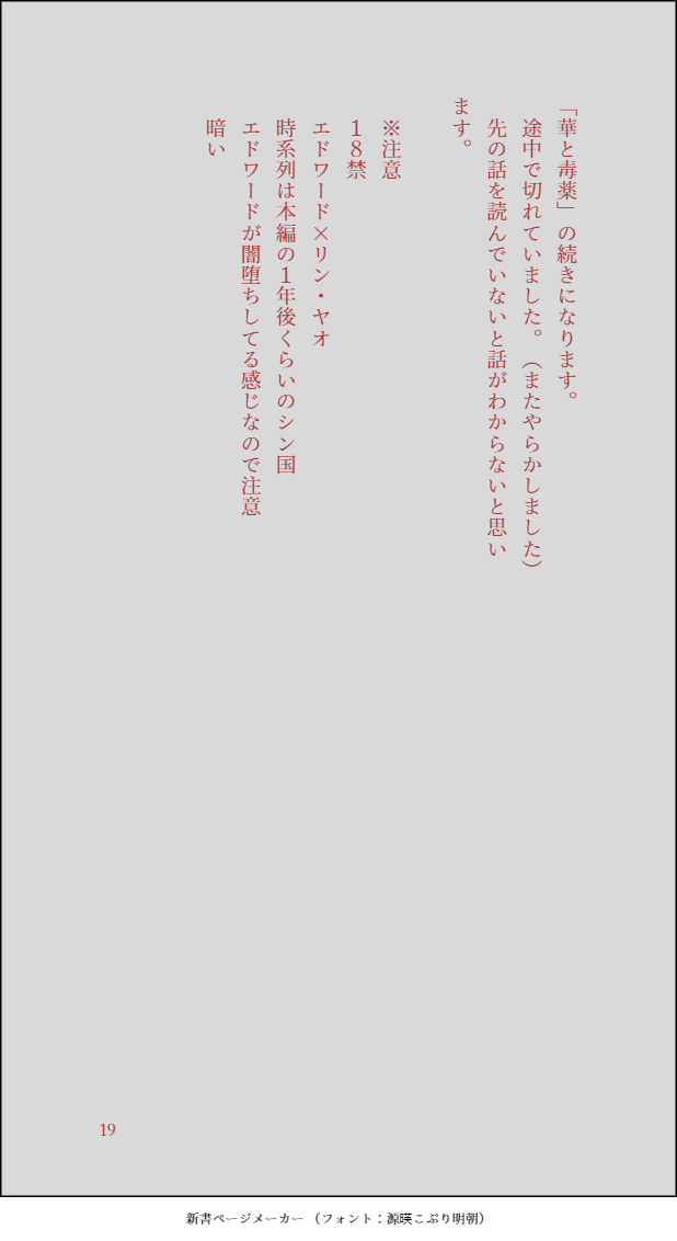 どろぬま☆quiet followDOODLE前に載せた「華と毒薬」の続きです。(またやらかして途中で切れてました)。ハガレン、エド×リン。あなたは18歳以上? y/n show hide show all(+8 images) Tap to full screen (size:618x1132).Repost is prohibited Let's send reactions! freqpopularsnackothersPayment processing Replies from the creator Follow creator you care about!☆quiet follow どろぬまDOODLE『殺人考~リンとグリードの罪と罰~(18禁)』ハガレン、グリ×リン。本編かなり捏造・独自解釈しています。残酷描写アリ。何でも許せる人向け。あなたは18歳以上?y/n 22 どろぬまDOODLE『ぐりぐり(18禁)』ハガレン、初代グリ・グリリン同軸リバ。現代パロ。居酒屋で出会った二人が行きずりの関係を持ちます。何でも許せる人向け。あなたは18歳以上?y/n 20 どろぬまDOODLE『湯殿の一幕(18禁)』ハガレン、リン・グリ同軸リバ。グリード生存分離ifシン国。皇帝として色々抱え込んでしまうリンと、世話人になったグリードがお互いに胸襟を開いていく感じの話です。あなたは18歳以上?y/n 29 どろぬまDOODLE『毒針をのむ(18禁)』ハガレンのエド×エン。13巻くらいのif設定でエド闇落ちしている。バドエンですが本編賛歌として書きました。ちょっと血がでます。あなたは18歳以上? 22 どろぬまDOODLE『リンも猫に(以下略』(18禁) グリ×リン生存if。都合のいい設定により今度はリンが猫になってシンの朝廷の一室でグリードとドタバタします。注意書きお読みください。あなたは18歳以上? y/n 22 どろぬまDOODLE『グリードが猫になった、理由なんてない(18禁)』グリ×リンの生存if。都合のいい設定によりグリードが猫になってシン国の朝廷でリンとドタバタします。注意書きお読みください。あなたは18歳以上?y/n 24 recommended works ronyoareaDOODLE⚠️🔞 1030 LIAMIERRE : The Deal🔥 Deno_018DOODLEchị styx bạo hành e phlega đáng thương キノコ魔人DONE⚠️キルキルネタバレあり、不謹慎 p:しゅれゆあくらりさ1周年おめでとう!!!!しゅれゆあは永遠だよ!!!!しゅれゆあに狂っていて申し訳ございません(二重の気持ち) tateroll_mjmoDONE円夏前提で円堂がヒロと風を犬として飼育しています。全部ifギャグですが円ヒロ風3P匂わせ、夏の離婚発言、天の去勢しろ発言あり。警告はしたので苦情は一切受け付けません。(わざわざ見に来て文句言うなよな!) 2 しゃしゃしゃDOODLEべび👹 2 名無しTRAININGお正月、どろろを観たら描きたい欲が再燃したいつか仕上げれたらいいな 御影真紀(意図巻)DOODLE筋肉わかりません urnwDOODLEtatsuさん(@tatsuSD7777777)の『Media Naranja』という御本の二次創作です。「Coast to Coast」沢リョ。ご本人様より掲載の了承を得ています。世界規模の遠恋をする沢リョがあまりにも良すぎて… 6 awaawaburoDOODLE🛩️AUまとめ単体絵、南陽航空ペア、玄真航空ペア、カプとしての風南 色々ごちゃまぜ 17