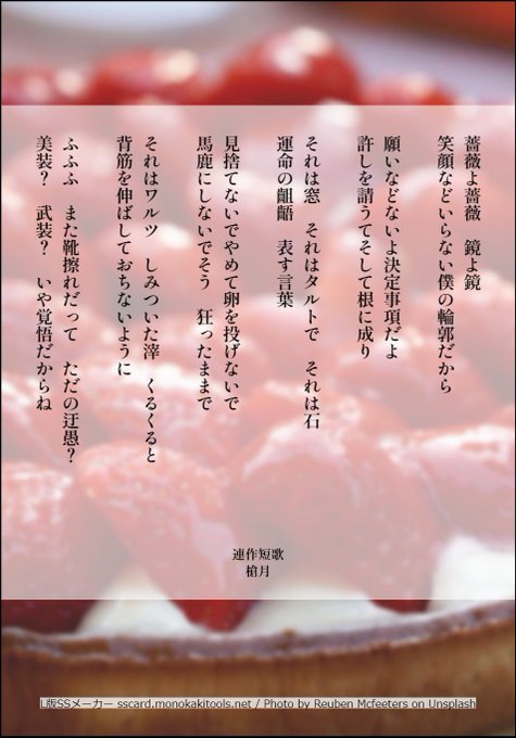 sp@槍月☆Тайно следоватьКАРАКУЛИツイステ リドル・ローズハート様モチーフの連作短歌 #twst #リドル・ローズハート #短歌 Нажмите, чтобы открыть (размер: 475 x 680) в полноэкранном режиме.Репост запрещен Отправим отзывы! частотапопулярныйлегкая закускадругиеПроцесс оплаты Ответы от создателя Следуйте за нами тайно!☆Тайно следовать sp@槍月Траурちょうど一年半前に書いた小説宇宙人は いた 花屋に コンビニに 雑踏の中に 目の前に 4831 sp@槍月СДЕЛАНОみずかみりいな様@writer_riina 主催の共同執筆企画『一週間の書架』 テーマ「月」で書きました1980~90年代の東南アジアが舞台のファンタジーBLです(暴力・性暴力に関する描写があります) 6642 sp@槍月СДЕЛАНОtwst短歌 リドル君モチーフでそれぞれ『RIDDLE』『ROSEHEARTS』の折句になっています 2 sp@槍月КАРАКУЛИツイステ リドル・ローズハート様モチーフの連作短歌 sp@槍月КАРАКУЛИ山中 千瀬様の#bit_310短歌ドロライ に参加した時の作品です水没の夢をよく見る あたしたち魚で生き残る二匹だった/山中 千瀬未来捏造 真希×真依の二次 ただの夢の話 2673 сопутствующие работы 卸@とても眠いКАРАКУЛИスカリーくん落書き。二枚目はグリムとゼロ可愛いねネタ。スティッチの時も似たようなネタ出したな。 2 小鳥女子@不定期更新СДЕЛАНО七夕なので初描きの星デュ。衣装が難しすぎる…。 ぽむ@🍏🍎🍏КАРАКУЛИフォロワーさんの推しを描くシリーズ あんずじゃむКАРАКУЛИカリム君HAPPY BIRTHDAY !ということで先天性にょたカリム君初描きです 小鳥女子@不定期更新СДЕЛАНО聞き分けが悪いと首をはねてしまうよ! kuroeggКАРАКУЛИ授業回してる時描いてたアナログ🎃♠︎くそ〜〜かわいい fukulotusКАРАКУЛИ描けば描くほど🦁の深みにハマっていく…タトゥーむずい kinoМИМО⚠️🔞注意⚠️🦇先輩と自室でのお勉強५✍ 1419 fukulotusКАРАКУЛИ👑練習 рекомендуемые работы meiraru58941КАРАКУЛИ過去絵と今絵をごっちゃ! 10 あっけらかんСДЕЛАНО企画の子 時雨(シグレ)СДЕЛАНОソロモン72柱のガミジンの立ち絵と設定メモTwitterに載せたやつです 2 132СДЕЛАНО はなまるFXСДЕЛАНО普段が低体温気味&熱をあまり出さないせいか、微熱でもびっくりするくらい体がしんどく感じる時があります(´・ω・`)でも37度くらいで大騒ぎをした時はさすがにちょっと恥ずかしく・・(*ノωノ)と言っても、うつすと悪いので無理はしませんが(*´▽`*) バシアСДЕЛАНО前上げた奴を少しいじりました ウニКАРАКУЛИゲス顔が楽しい なーピーマヨネーズОБУЧЕНИЕ文字配置とか服のシワの練習がしたかった 魚ぜんまいПРОГРЕССストレス過多でうまれたほんわかダークエルフ巨乳お姉さん