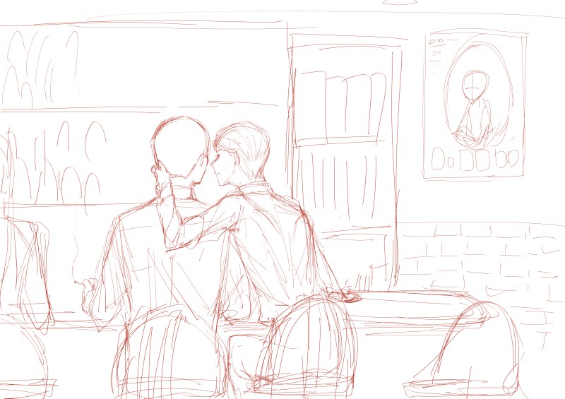 都内のバーで見かけた女性二人の仕草にときめいてしまった~というのを推しCPに当てはめた キスするわけではなくて、ジャズバーだったので顔を近づけないと演奏の音で声が聞こえないって状況だったんですよね~ 顔を近づけるだけでなく、相手の首の方に手を回して引き寄せてるのがなんとも艶やかで… よかった…