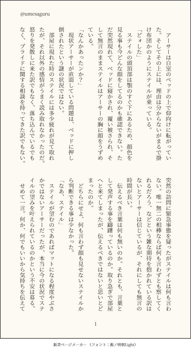 梅村。☆quiet followDONE8月1日はおっぱいの日です。(多分)ステアサ。 #ステアサ stealthAsafety show all(+2 images) Tap to full screen (size:618x1132).Repost is prohibited Let's send reactions! freqpopularsnackothersPayment processing Replies from the creator Follow creator you care about!☆quiet follow 梅村。DONEお誕生日おめでとうございます副団長~~~のはずなんだけどなぁ?モブクラ、クラモブが発生する理由について。 4 梅村。DONEバニーの日やんけ!となって勢いで書いた現パロモブクラ。だって似合いそうな人がクラしかいなかったんだもん。 4 梅村。DONEアラカラ。アラ隊長視線にしたら大騒ぎになりました。 7 梅村。DOODLE隊長お誕生日おめでとうございましたーのアラカラ。 2 梅村。DONE三番隊隊長就任直後。の、一案。 5 梅村。DONE現パロアラカラ。TLに放流してたやつです。だって某aこさんが何色って聞くから…… 3 related works ムラカミDONEステアサ友人以上恋人未満な2人のお出かけ。金木犀(オスマンサス)があるという設定捏造あり。 4 梅村。DONE殿団。ステアサすらまだ書いてなかったのに、公式様からの供給で滾ってしまった……。全部の悪を引き受けてティアラを擁立させようとするステと、ステにまだ良心が残ってるって気付いちゃうアサ。 2 イトコDONEkmhkステアサ(殿団)より殿アサ。前に書いたステ団の、殿アサver.お部屋お決まりの冒頭は端折りました← 8 梅村。DONEステアサ。あの時の大量の眼鏡、まだ保管されててほしい。 5 @かもMAIKING灯、消してくれ/ステアサ取り急ぎ下絵 2 梅村。DONEステアサで現パロ?吸血鬼ネタ。特にハロウィンとは関係ない。吸血鬼ネタを書かせるとギャグになる呪いにかかった私の精一杯です。18禁ではないけど、頭の悪さ的に15禁くらいにしたい……。 10 梅村。DONEパウエルとお友達になれてよかったね記念のステアサ。 8519 47_kwtDOODLEステアサは酔った勢いでキスの練習とかが始まりだといいと思います😌🍺でも、こいつだからキスしても良いかなって思ってて、お互い他の人なら酔ってても絶対キスなんかしない…!んで、思った以上にキスがよくて、どんどん沼にハマっていけば良いと思うよ🤗もっとやれ 梅村。DONEステアサケーキバース。本当はR18Gな世界観だけど、R18Gにするとクレカ登録者しか見えない問題が発生したので各自での自衛をお願いします。グロ要素皆無ですが。ステがフォークで、アサがケーキな世界線。正直ケーキバースを名乗るのも烏滸がましいのである意味注意。情緒は捨てた。 3