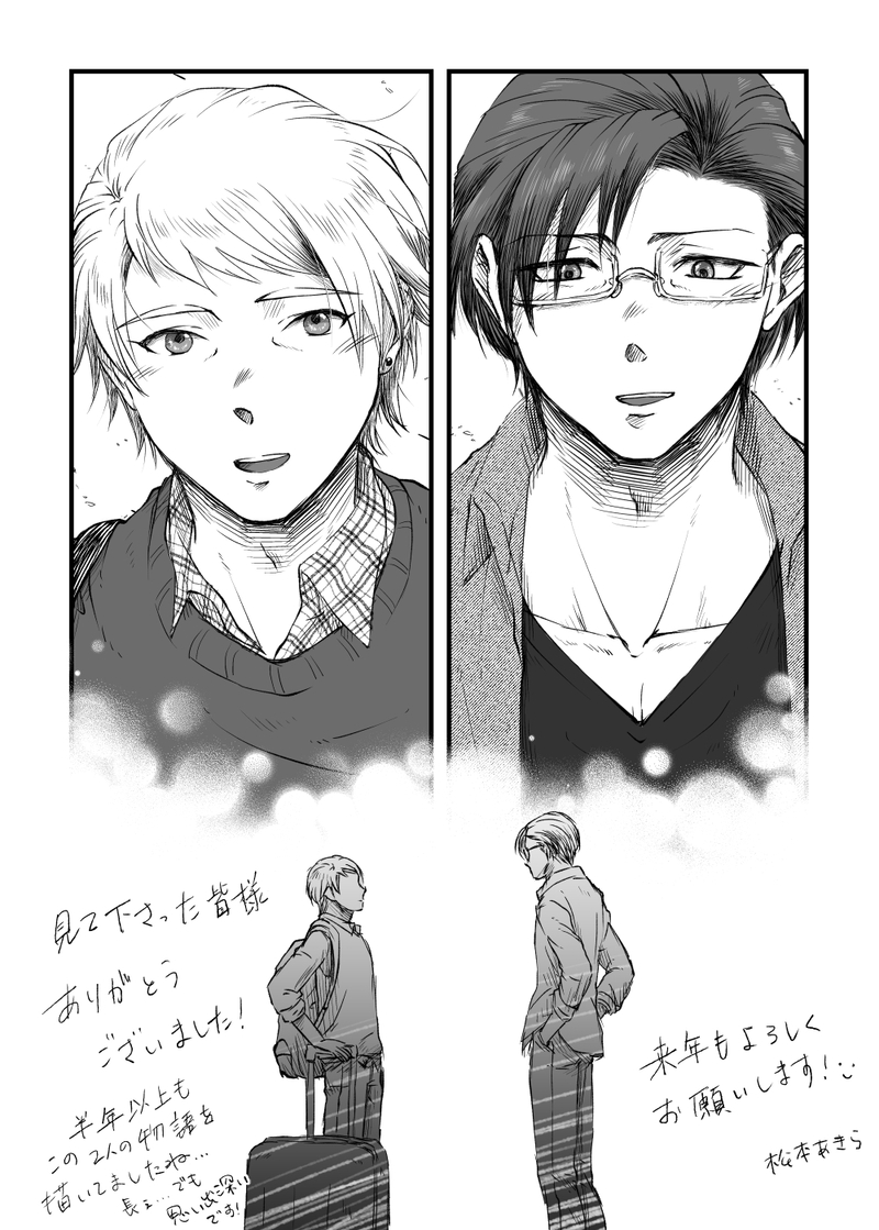 松本 あきら☆quiet followDOODLE今年も見て頂いてありがとうございました~思い出深い2人で描き納め…😌来年もよろしくお願いします!後でサムネ出来次第pixivにまとめ上げる予定です作業しながらゴール〇ンボンバーの200時間配信見てるけど、手が止まり過ぎる…歌だけならなんとかいけるけど、曲の間の演出と演劇つい見ちゃうのよね~楽しいそれでは皆様良いお年をお過ごしくださいませ~! Tap to full screen (size:1000x1399).Repost is prohibited Let's send reactions! freqpopularsnackothersPayment processing Replies from the creator Follow creator you care about!☆quiet follow 松本 あきらDOODLE行七(トモコレ)お互い不満状態だけど別れたくはないんだろうなーという雰囲気がずっと続いてるまた仲良くなるきっかけを探しているのかもだって同じような色味の服に勝手に着替えてるし、相手にバレないように気にしあってるし、ほんとは仲良くしたいんだよね?ね?(圧)ご機嫌取りに旅行券あげたけど、やっぱり親友と行っちゃったかー…まぁぎこちない2人も可愛いので、これはこれで楽しい 9 松本 あきらDOODLEモブ七 8 6 松本 あきらPROGRESSモブ七進捗早くいちゃつくとこ描きたい(もう少し先)ペンがダメになったはずなのに試しに使ったら、普通に使えるようになってた一時的な接触不良だったのか… 松本 あきらDOODLEかざまくん誕生日おめでとう~新規絵、髪を耳にかけてるんだよね?なんか新鮮…!かわいい。今日は天ぷら蕎麦でも食べてお祝いしよう誕生日なのにモブ風…誕生日絵とか苦手なんだー…なんかストーリーがないと描けなくて😅最近ペン壊れちゃって新しいのにしたけど、前に適当にいじった設定覚えてなくてまだ筆圧迷走中…ぼーっとしてるかざまくんが、近い気がするんだけども定まらんねぇ… 3 松本 あきらDOODLE9月なっちゃったけど水着~8月中に上げたかったのに七くんのビキニの色でめっちゃ悩んでずれ込みました結果的にオレンジにしたけど、どれも捨てがたいので小さいけど一覧にした白もよかったかも。忘れた。1枚目の風本七、普通の水着姿見てーなーと思って描いた上裸が見たいよ私は 4 松本 あきらDOODLEうすた展に行ってきて楽しかったよーという画像と感想です(主にジャガーさんの)原画を楽しみで行ったら、立体物のクオリティもすごくて驚いた…!本当に見に行って良かった…😊あまり知らないのに一緒に見に行ってくれたお友達にも感謝しかないです。どうもありがとう!帰りの新幹線2時間半遅れた以外は全部楽しかった😂 17 recommended works 🌷💸あ💌💮DOODLEたのしみ~ 3 しゃもの裏SPUR ME続きの続き。七ツ森とマリィが風呂に入ってるだけ漫画①~③。結局R15から抜け出せなかった気がする。スンマセン 3 ramnim らむDOODLEᐡ⸝⸝ᴗ ̫ ᴗ⸝⸝ᐡ風マリ ぱんきちPROGRESS七マリ錬成中( *´︶`*) ナヅナDOODLE七マリ🎂 3 h_qhx5TRAININGやのすけくん描いて見ました🥺 askmDOODLE大ちゃん練習推し ______freDOODLE使えるスタンプ()シリーズ 5 hihastogaDONE【GS4】6/23颯砂くん誕生日おめでとう!!!!🎊🎉君がキングや…👏