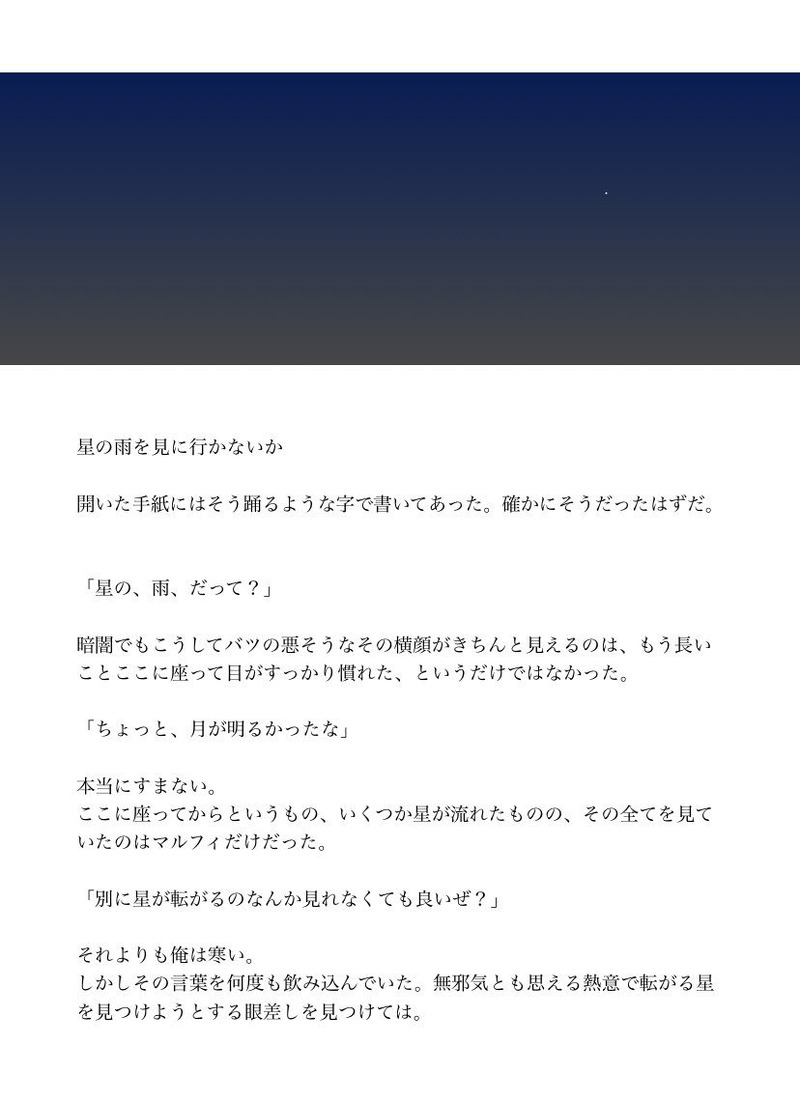 めんつゆ☆quiet followPAST【君にアルデバランを】紫組ワンドロ作品/お題「寒空」 #手下 underOnesControl #紫組 blueClass show all(+2 images) Tap to full screen (size:828x1140).Repost is prohibited Let's send reactions! freqpopularsnackothersPayment processing Replies from the creator Follow creator you care about!☆quiet follow めんつゆDOODLE紫組 めんつゆDOODLE蛸と烏と? めんつゆDOODLE【だいたいあいつのせい】紫組「なんでかって? ほら、彼働きすぎだろう?」貴方は紫組で『だいたいあいつのせい』をお題にして140文字SSを書いてください。https://shindanmaker.com/375517 めんつゆMOURNING【サーカス】蛸と烏と少女と(お題は手下ワンドロ2022様より) 2987 めんつゆPAST【たったひとつのエンディング】紫組貴方は紫で『たった一つのエンディング』をお題にして140文字SSを書いてください。shindanmaker.com/587150 めんつゆPAST【雨も、悪くない】紫組貴方は紫組で『雨も、悪くない』をお題にして140文字SSを書いてください。shindanmaker.com/587150 related works めんつゆPAST【舞い上がれ】紫組 めんつゆDOODLE【だいたいあいつのせい】紫組「なんでかって? ほら、彼働きすぎだろう?」貴方は紫組で『だいたいあいつのせい』をお題にして140文字SSを書いてください。https://shindanmaker.com/375517 めんつゆPAST【烏のみたもの】紫組 2 めんつゆPAST【君にアルデバランを】紫組ワンドロ作品/お題「寒空」 3 めんつゆPAST【たったひとつのエンディング】紫組貴方は紫で『たった一つのエンディング』をお題にして140文字SSを書いてください。shindanmaker.com/587150 めんつゆPAST【物語】紫組名前を無くした蛸の話 7 瀬崎🐈⬛DOODLE紫組 めんつゆPAST【雨も、悪くない】紫組貴方は紫組で『雨も、悪くない』をお題にして140文字SSを書いてください。shindanmaker.com/587150 瀬崎🐈⬛DOODLE紫組 recommended works はちたこDONEjh🃏#手下 #ジャックハート はしたみPROGRESS #手下 しはつえきDOODLEお友達の誕生日にかいた#手下 atok_mnDOODLE #手下 #アップルポイズン きりゅーPASTミスターブイブイ、お髭がキュート( ˇωˇ ) MIRACLE MILKMOURNINGエイトフ ウェーイ 7 MIRACLE MILKTRAINING aytk_2085PAST多分人生初描きの♥ 彩紋 つおんDONEツイステ&手下①ツイステは良いぞ