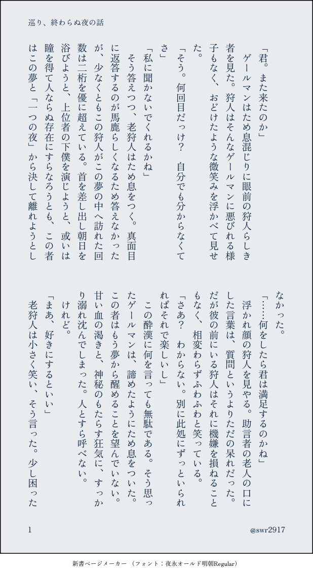 周回しすぎて様子がおかしい狩人と、それを眺めるゲールマンの話。