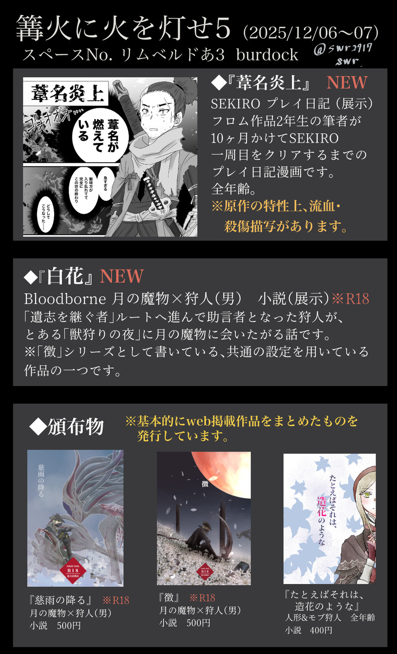 🥗/swr☆quiet followMENU2024/12/06〜07開催の「篝火に火を灯せ5」の仮お品書きです。作品に関してはポイピクかクロスフォリオで全作全文読めます。ポイピクから見る際は各作品名のタグ使用がおすすめです。イベント会場→https://pictsquare.net/7dp2ye9urzupos1d955ncnjjevlij252(R18作品には全てパス有り)どうぞよろしくお願いします〜(2025/11/28) ##お知らせ ##フロム作品 ##SEKIRO ##Bloodborne show all(+2 images) Tap to full screen (size:1032x1701).Repost is prohibited 🥗/swrDONE※R18(明確な性描写)Bloodborne 月の魔物×狩人「遺志を継ぐ者」後に助言者をやっている狩人が、とある獣狩りの夜の途中で月の魔物に会いたくなる話。『徴』シリーズです。過去作から順に読みたい方はクロスフォリオがおすすめです。→https://xfolio.jp/portfolio/uxypt20/series/809237パス:18歳以上か否かを半角英数字(2025/12/06) 16738 🥗/swrDOODLEELDEN RING NIGHTREIGHN プレイ日記漫画。「篝火に火を灯せ5」併せの新作です。1ページ完結、基本明るくギャグ寄りです。楽しんでいただければ幸いです!(2025/12/06) 9 🥗/swrDONE※殺傷描写・出血描写・ラスボス及びエンディングまでのネタバレあり『葦名炎上』SEKIRO プレイ日記漫画。「篝火に火を灯せ5」併せの新作です。基本的には明るくギャグ寄りに描きました。楽しんでいただければ嬉しいです!(2025/12/06) 21 🥗/swrPROGRESS2025/12/05進捗②ページを少し減らしてとにかく進めたあと実質2ページです がんばります(2025/12/05) 🥗/swrPROGRESSナイトレイン漫画進捗とりあえず今日は1ページと2コマ進みました1ページごとの読み切りなので、できたところだけ出しとかでもいいかもしれない……(諦め) (2025/12/05) 🥗/swrPROGRESSナイトレインプレイ日記進捗とりあえずネームをスキャン→枠と文字入れまで12ページくらいになりそうです(きちんと完成すれば)頑張れるところまで頑張りますが、間に合わなかったらのんびり仕上げることにします……みんな作画コストが高い……(2025/12/01)