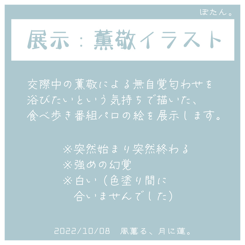 button_zatta☆quiet followDONE薫敬webオンリー開催おめでとうございます!!主催者さま、参加者の皆さまへの感謝の気持ちでいっぱいです。薫敬愛に溢れる一日となりますように…!執筆が間に合わず半端な展示物になってしまいましたが、賑やかしになれば嬉しいです。ぼたん。 show all(+14 images) Tap to full screen (size:1560x1560).Repost is prohibited Let's send reactions! freqpopularsnackothersPayment processing Replies from the creator Follow creator you care about!☆quiet follow button_zattaDONE薫敬webオンリー開催おめでとうございます!!主催者さま、参加者の皆さまへの感謝の気持ちでいっぱいです。薫敬愛に溢れる一日となりますように…!執筆が間に合わず半端な展示物になってしまいましたが、賑やかしになれば嬉しいです。ぼたん。 15