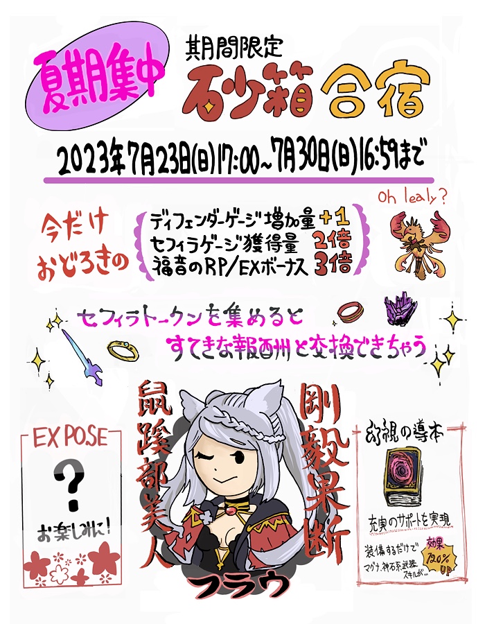 外伝お得チラシ今回は大遅刻しました。前日まで土有利古戦場で張り切りすぎて10億報酬完走したり、フラウさんについての情報がぼかされすぎて薄すぎるのとバトル中の性能も個人的に活かせてなくて理解が足りないのと色々あってめちゃくちゃ悩んだんですね…。言い訳。