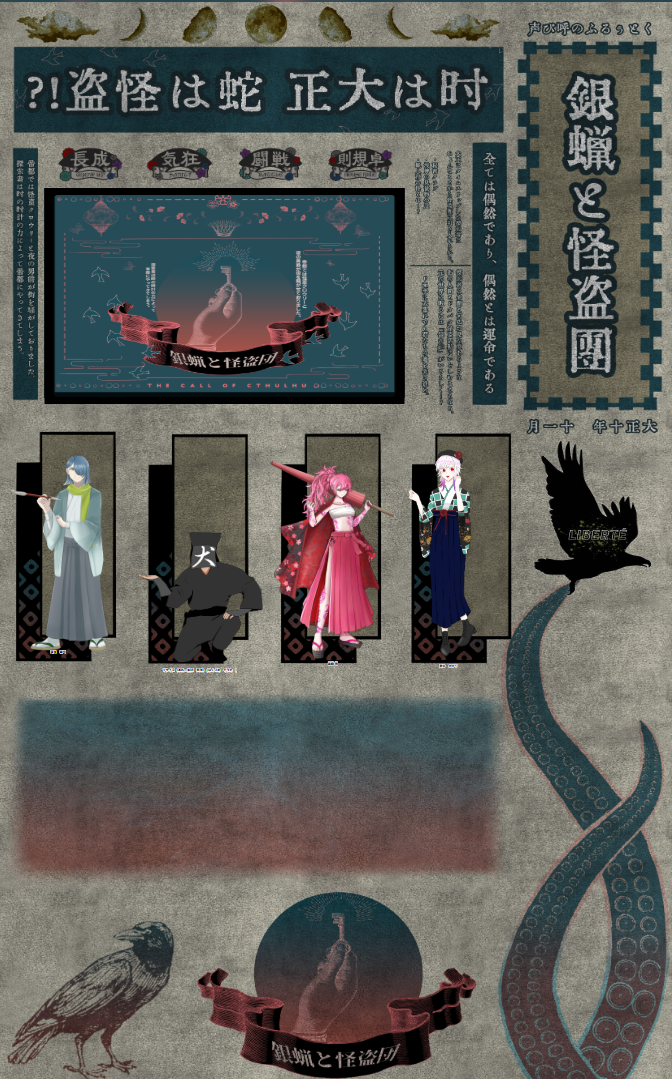 tubasa_trpg☆quiet followMEMOCoC「銀蝋と怪盗団」2025/1/24、26日 show all(+1 images) Tap to full screen (size:672x1079).Repost is prohibited Let's send reactions! freqpopularsnackothersPayment processing Replies from the creator Follow creator you care about!☆quiet follow tubasa_trpgMEMOエモクロア「超怪獣クトゥルー」DL:ゆずさん HO2芸術家:つばさ(磁場 寸愛)HO4医者:あめじのな(手代森 亜衣朱)HO5教授:きりんさん(林郷 千聡)2生還1ロスト tubasa_trpgMEMOCoC「1D10で探索者がアホになるTRPGシナリオ」KP:あるらさん(雪乃 戦稟)PL:タイムラピスさん(未畑 李心) 塩ビさん(雪村 光太郎) つばさ(虎杖 桃音 )ENDA 全生還 2 tubasa_trpgMEMOエモクロア「三殻」DL:タイムラピスさんPL:つばさ(吉備 穀美) 黒豆さん(岩黒 金美)全生還 tubasa_trpgMEMOCoC「陽炎教室」 KP・作者:タイムラピスさんPL:つばさ(秋野森 楓)END1 生還 tubasa_trpgMEMOCoC『匵紊-ドクビン-』第2話「箱庭の蜘蛛」KP・作者:黒豆さんPL:タイムラピスさん(還華 芳史) つばさ(秋野森 楓)END1 全生還 tubasa_trpgMEMOCoC「全ては眠れない夜のために」KPレスPL:つばさ(秋野森 楓)END3:全ては眠れないあなたのために recommended works sataneseMDONE总而言之是第一次尝试的四爱,写得各种意义上水平不高不下,也许会二修密码:18↑?(yes/no) 6857 たすけてDOODLE色々注意、キャラ崩壊かも、すみません 5 sato_rebotsunaDONEツナ京、獄ハル、山クロ高校生でみんな付き合ってる。トリオのトリプルデートです 9542 由貴(ゆき)TRAINING【カラー絵練習の露✒️⚠️差分】素材の液体ブラシ楽しかった☺️笑 yutannpoDOODLE すずらんDOODLE相互さんのにょた🦆見てたら勝手に手が…※🦆女体化 auk_pDOODLE🐴❄️1️⃣ SHODOODLEラチ yuzu_iaiaMEMOCoC【VEX THE KNOX】KP:ゆづ PL:Uさん真面目な探偵助手君と、愉快犯で助手君を引っ張り回す探偵の2人で行ってきました✌️✌️冤罪も晴らしていただいたのでね!これからもたくさん助手君のこと引っ張り回します!(???)Uさんと初卓でしたけれど楽しかったー!またぜひ遊んでください💕💕「さぁ、助手君!楽しい謎が私たちを待ってる。いくぞ!」