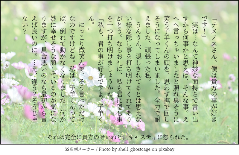 nanayuraha☆quiet followMOURNINGクリテメで診断様の導き1月分。思ってたよりも沢山あった、驚きです。 show all(+16 images) Tap to full screen (size:910x590).Repost is prohibited Let's send reactions! freqpopularsnackothersPayment processing Replies from the creator Follow creator you care about!☆quiet follow nanayurahaMOURNING一度目、二度目、じゃあ三度目は?的なクリテメ。大した事はないし隠す必要はないけれど、恥ずかしいので。貴方は18↑? y/n 2526 nanayurahaMOURNING頭痛持ち胃痛持ちオルト君と、クリテメの結婚式と。本日のクリテメまとめ本より切り抜き。 810 nanayurahaDONEテーマ:科学、もしくは炎色反応。 4805 nanayurahaDONEテーマ:聖歌? 2712 nanayurahaMOURNING結婚式的なアレの前日な感じのクリテメ、オルト君を添えて。 3 nanayurahaMOURNINGクリテメで、なんかよく分からなくなったもの。疲れてる子羊くんと、許すテメノスさんと。特に何でもないけれど、恥ずかしいので無意味にワンクッションしてみる。 2 recommended works diodio_0807DOODLE⚠️ふた、女攻女噴🔞 2 hedgerow18SPUR ME需要輸入卡片上的PASSWORD觀看。谢谢支持!奖励番外R爆頁數了!!!結果又推遲了一週更新,讓大家久等了!希望食用愉快! 13 寒凌hDOODLE😭🌷 りんごDOODLE2/11 高津御杯DOODLE長こへ♀のおせっせ対面座位が好きそうだし、普段の小平太からは考えらんないくらい感じ入るような、囁くような喘ぎ声だと私がめちゃくちゃ元気になります😇いつも通りの声量の喘ぎ声も好きだけど、ギャップの大きいキャラゆえ声小さいて破壊力抜群だと思います😇🔐=18↑? y/n Aki_stn_mnmDOODLEアラララげんみ✖ 自陣〇 11 ゆ○れDOODLEなんだろう…もう髪型とかあんま関係ない感…あとコナくんのほうが顔の安定感ない。自分絵と頑張って似せた絵の差がよくわかるな~へへ…ハート💖ありがとうございます!😊 3 まろどみたろさんDOODLE山田A×Bのガッツリスケベ♂♂⚠️背後注意⚠️ 雪風(ゆきかぜ)。DONE「物心ついたときからタンポポの実験体として生きてきて、ずっと価値のない命だと思っていた… だけど君の役に立てることが嬉しい。 …あれ、おかしいな。『スパイに感情的な問答は必要ない』はずなのに。」