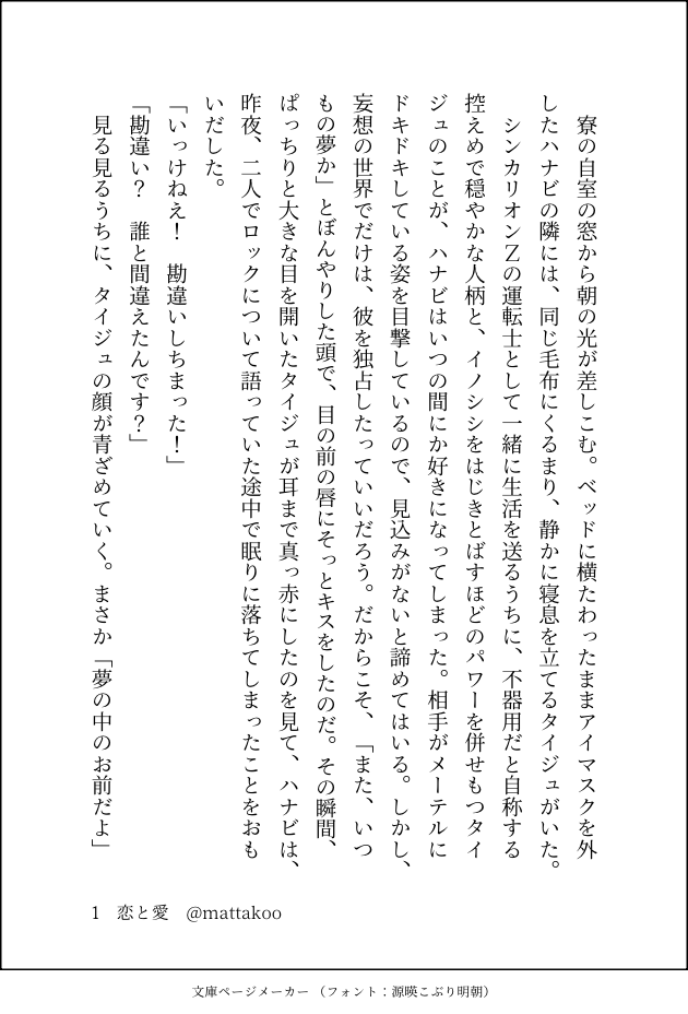 mattakoo☆quiet followDONE恋と愛(シンアブ前提のタイハナ) show all(+2 images) Tap to full screen (size:630x928).Repost is prohibited Let's send reactions! freqpopularsnackothersPayment processing Replies from the creator Follow creator you care about!☆quiet follow mattakooDONE誕生日プレゼントの話(シンアブ) 4 mattakooDONE #ささろワンドロライお題「告白(こくはく)」 mattakooDONE #ささろワンドロライお題「迂闊(うかつ)」内緒で付きあっているささろ+0️⃣ mattakooDONE彼シャツはロマン(タイハナ) 2 mattakooDONE恋と愛(シンアブ前提のタイハナ) 3 mattakooDONEハッピー真ん中バースデー!!(タイハナ)素敵な企画をありがとうございます! 2 recommended works 夏の枝蛙DOODLE SasameDONE細雪とこの獠ちんと香にゃんは、文中に『氷』を入れて【解って欲しい】をイメージした140文字作文を書いて下さい。#140SS #shindanmakerhttps://t.co/rV0htt2t08(*´ω`*)クフフ はすさんDONEhttps://shindanmaker.com/pic/s_572991/632f01edd4efe4b164f0f9d3a396482fa80716df_wct このカラーパレットで描いてみましょう。#shindanmakerhttps://shindanmaker.com/572991 (*ΦωΦ*)DOODLE貴方はみつひかで『味見と毒見と、』をお題にして140文字SSを書いてください。#shindanmakerhttps://shindanmaker.com/587150表で出したやつにおまけ?文字数オーバーしたやつをつけただけ。人狼と王子、他人軸のみつひか。ファンタジーだいちゅき。これ……お題……沿っ……て、る……? 4 かほる(輝海)DONEシティーハンター冴羽獠×槇村香原作以上の関係あなたはかほるさんちのRKで【夢に見たほど / 惑わせないで】をお題にして140字SSを書いてください。#shindanmakerhttps://shindanmaker.com/780366まだあまり慣れていない設定😂 151 まなまかDONE買っていたさくさくぱんだが溶けてでろでろになってしまいしょんぼりするセイ君#推しのおやつタイム #shindanmakershindanmaker.com/933283 高間晴TRAINING貴方は晴のチェズモクで『たった二人の世界』をお題にして140文字SSを書いてください。#shindanmakerhttps://shindanmaker.com/375517 TKrvg_1000DOODLE診断メーカーの【東京卍リベンジャーズの世界に入ってみた】の8/31時点の結果で遊んでみたセンさんが東京卍リベンジャーズの世界に入ったら雰囲気:千堂敦のような人顔の印象:佐野万次郎のような人髪色:オレンジ髪型:ソフトモヒカン身長:161喧嘩の強さ:★★★慕われ度:★★★★所属:愛美愛主相棒:灰谷竜胆です。#shindanmakerhttps://shind 高尾みどりDOODLE5RTされたら、「そんなの断れるわけないじゃないか」という台詞を使ったみどり本丸のきよみつくん1コマ漫画を描きます。#shindanmaker #この台詞を使って1コマ漫画