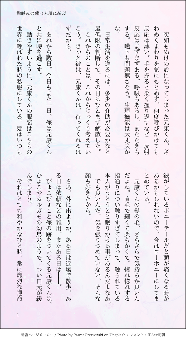 すたうさ☆quiet followMOURNINGメルロ(メルアフ)槍盾微睡みの蓮は人肌に喜ぶ ##たてゆ show all(+1 images) Tap to full screen (size:618x1132).Repost is prohibited すたうさMAIKING現パロ槍盾(初期槍×マイルド盾)お鍋を一緒に食べたいお年頃。多分完成させたら本に収録します。多分ね。 2728 すたうさDONE初期槍盾。誕生日を祝いたい陽キャと祝われたい陰キャ 3676 すたうさDONE※再掲文字版現パロ槍盾(初期槍×ワイルド盾)柔軟剤の話とかどうよ。尚文くんは果物のグリーン系で元康くんは甘めのフローラル 1955 すたうさDONE※再掲文字版現パロ槍盾(初期槍×マイルド盾)コンビニに行って買い食いする2人のお話。 3021 すたうさDONE※再掲文字版初期槍盾。夜にばったり会った二人が宿に繰り出す話。 2467 すたうさMAIKING※再掲文字版メルロ(メルアフ)槍盾♀。先天性女体化。廃人槍をお世話してるメルロお義母さんがよしよしせっくすする話。多分仕上げて本に収録予定。 5574 recommended works A·GDOODLE一个一个的选一片,真的好麻烦 10 elle_niyaMAIKING壬猫。推しカプは一緒に寄り添って寝ててほしい。 NDPFDOODLE我都沒得說了 おたまDOODLE 4 生き恥MOURNING主主ジン主の主と主ジンの主がまぐわってる。攻め王に「どうしてほしい?」って言われて攻めジンに調教された結果まあまあ恥ずかしいオネダリをする受け王の図全てに注意 おのぽPASTウインクをする📦GIF MUWENDAWNDOODLE BaO9iDOODLE人外ちくがいます 3 sanosano2332SPOILER⚠️CoC:Paranormal Crime 全話ネタバレ!立ち絵とネタバレイラスト🔑はシナリオで登場した「あの数字」 4