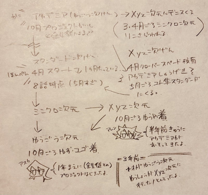 ARCV本編のやんわり時系列の事を考えて1年と半年が過ぎたのでおさらいがてら軽くまとめてみましたひとりで考えまとめているので私個人の解釈自体間違っている部分が多いと思う、私がユト、隼瑠璃の3人が出会って1年前後だ~(ユト中学1年時点)って言ってる原因の1つです。(本編ユト瑠璃14歳<中学2年>の考えです)