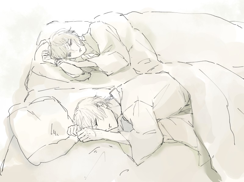 起きようとしたけどまた寝ちゃった弟と、まだ起きるつもりはないけど弟が動く気配で起きて弟見てる兄者☀️