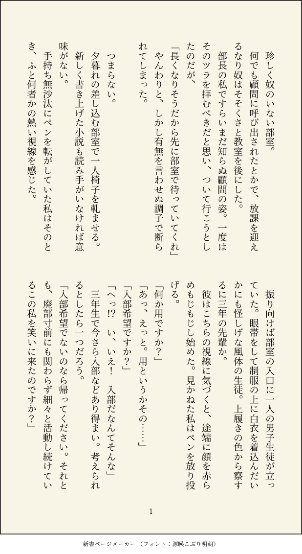 はとむぎ☆quiet followMOURNING以前ツイッターに上げた現パロ博玉超短編小説。高校生の玉森くんと博士の出会いのお話です。玉森くんと水上が文芸部に所属している設定(水上は出てきません)。ちなみに顧問はゲーム本編でも姿を見せないでお馴染みのあの人(こちらも出てきません)。 show all(+3 images) Tap to full screen (size:618x1132).Repost is prohibited Let's send reactions! freqpopularsnackothersPayment processing Replies from the creator Follow creator you care about!☆quiet follow はとむぎDONE「花時雨」過去作「夏時雨」から翌年春の後日譚。現代転生した水玉が同棲しながら一緒の大学に通ってます。女子学生を助ける水上を偶然見かけて嫉妬していた玉森くんと、桜の景色に誘われ前世の記憶に思いを馳せる水上の話。⚠︎生理ネタ ⚠︎過去捏造(前世百合)有り 10 はとむぎDONE「黄金日車の涕く海で」「一緒に暮らそう」が言えなくて孤軍奮闘する玉森くんの話。「君がため」未読の人間が書いた向日葵と水玉の妄想です。ここだけで勝手に作った設定や自己解釈を多分に含むので注意。名前は出ませんがオリジナルの女性記者が登場します。 60 はとむぎMENU水玉小説本「夏時雨」の紹介と本文サンプルです 29 はとむぎDONE「緑雨」現代に転生して同じ大学に通っていて、水上√で玉森くんと結ばれた記憶を持つ水上が、記憶を持たない玉森くんに誕生日を祝われる話。過去作「夏時雨」の3ヶ月前の話で前日譚にあたります。「夏時雨」を読んでなくても何となく読める内容だと…思う…多分…「この会話が初めてじゃない」とか自分の誕生日への捉え方とか諸々捏造過多、ここだけの設定です。 14 はとむぎDOODLE4月〜4月(1年)まとめ 37 はとむぎMOURNING恥ずかしくて載せられずにいた水玉たち🔑:水上が首にかけてる◯◯◯(ひらがな) 15 recommended works DADATAdaaaaanDOODLE大急ぎで描いたけど案の定ラフしかできなかった劇団玉森くん…!橋姫の日おめでとう(?)ございました! DADATAdaaaaanDOODLE玉森くん誕生日おめでとう! madobe_rakugakiDOODLE水玉ルートの玉森くんはツンがとてもいい 2 madobe_rakugakiDOODLEそう言って全部するまでが水上 篠原BLANK(橋姫)魔法使い博士少年と相棒の黒猫玉森くん/博玉…? madobe_rakugakiDOODLETwitterにあげた水玉 4 madobe_rakugakiDOODLE 優しいゴリラさん🦍PASTTwitterに載せたもの格納③川玉多め 21 marija_scaleTRAININGちょっとえっちな表情練習(博玉)