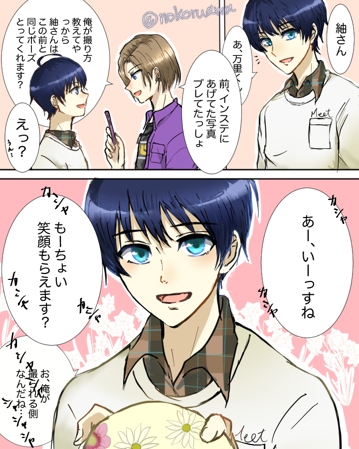 ブログ本、9月19日のページの「にしても至さん、マジでファインプレーだわ」って文言が、「ファインプレーだわ(牽制)(でも紬さんに写真の撮り方教えんのは俺の役目な)」に見えてきてしょうがなかったので、万里くんの画像フォルダを潤す感じの漫画を書いてみました(?)