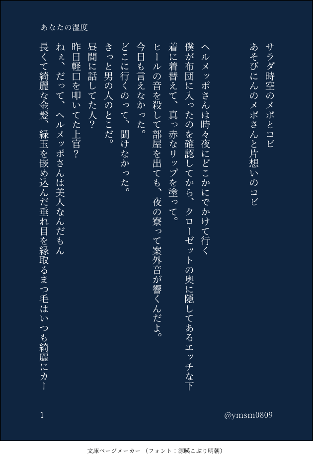 ymsm0809 @ymsm0809 メコメの新参もの。ロジャレイ、エーサボも嗜む。基本18禁。pixivに載せられないほどの短文投下用。グロ好き。天真爛漫なコビちゃんいません。 ☆quiet follow Yell with Emoji POIPOI 20