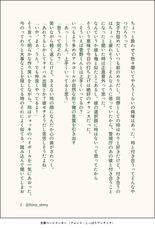 hino_stmy☆quiet followDONE菅玲(←春?)フォロワーさんのイラストからイメージして書かせていただいたお話(フォロワーさんに許可いただいて書いたものです)夏樹くんと付き合い始めた玲ちゃんにお酒の力も借りて色々と聞き出そうとした春くんだったけど、そこに夏樹くんが現れて… #スタマイ stamae #菅玲 #春玲 chunling show all(+4 images) Tap to full screen (size:630x928).Repost is prohibited Let's send reactions! freqpopularsnackothersPayment processing Replies from the creator Follow creator you care about!☆quiet follow hino_stmyDOODLE【勝手に妄想してみたを勝手にまとめてみた】twitterでちょこちょこと呟いていたとんでもなく自分本意の妄想が並んでるだけです 6 hino_stmyDOODLE夜を営むヒーローズ(耀玲、カナ玲、菅玲)妄想を促す短文が書きたかった 3 hino_stmyDONE嘘にならない嘘/早乙女→玲⇔瀬尾暗いです。早乙女さんが報われないです。なので、苦手な方はご注意を! hino_stmyDONE耀玲スタマイ勢はみんないい香りがするんじゃないかっていう妄想から書いてしまった hino_stmyDONE桜と恋のキューピッド?/芝玲*芝の日記念SS芝さんのところへやってきた玲ちゃん。何やら相談事があるようで…… 4 hino_stmyDONE京介くんお誕生日SS僕に夢中なキミと俺/京玲せっかく二人きりになれたのに、キミは画面に夢中で…… 3 related works jun_horai0111swDONE初書き宏玲初デート(仮)の一幕とでも思って頂ければ|*・ω・) 2 雨音 鈴DONE桧山さん🎉お誕生日おめでとう!!ギリギリ間に合った~ペン入れはアナログでやってみました。いつも桧山さんの言葉に励まされます。強さとは、温かさであり、優しさ。これからも桧山さんを応援していきたいなぁ。 jun_horai0111swDONEフォロワーさんとの企画で、「春」と「ほんわか」のテーマで書いた蒼玲ちゃんです❤素敵なタイトルをフォロワーさんに考えてもらいました~(∩˘ω˘∩ )♡ 4 カヤコDONEstmyイメージお題企画よりお借りしたお題で♡耀玲×2、関玲、渡玲の4話 6 小夜の倉庫DONE「恋は人を愚かにする」(誠玲)/2018.1.21誠玲も増やしたい……。 6 小夜の倉庫DONE「Marking」(潔玲)/2018.3.2プライベートでの潔くんの嫉妬台詞があまりにエモかったので。 5 小夜の倉庫DONE「白に包まれ」(宮玲)/2018.2.19本編未完結の時期に書いたものなので、しんどい感じになっています。 4 うめ@眠いPASTお試しで過去絵#スタマイ #宮瀬豪 saya_starmoonDOODLEお試しぽいぽい。司玲ちゃん。#スタマイ recommended works hinaDOODLE関さん#スタマイ もなDONE jun_horai0111swDONEホワイトデーの羽玲ちゃんですバレンタインデーのお話の続き。 4 結城ぱんだDONEにゃんにゃんにゃん かなかなTRAINING樹玲『死ぬまでの君を全てください』 5 カヤコDONE sirohumoDOODLE宮瀬編クリア記念!結果、九条さんが気になる存在になりました。本編早く配信されないかなぁ。 kyorochan_nhrDONE槙慶太本編完結での神楽さんがとても心に来たので書きました。お読みいただいた方からのご感想お待ちしております!!ご感想をこれからの作品の力にします! 7 jun_horai0111swDONEフォロワーさんとのコラボで書いたちょいエロな関玲です(*´ω`*) 5