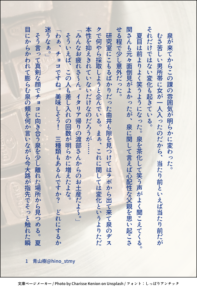 hino_stmy☆quiet followDONEバレンタイン?SS青山樹(→玲)甘くないです。自覚した想いにくすぶる樹さん。チョコレートが出てくるので、バレンタインに上げてみた。 #スタマイ stamae #青山樹 aoyamaTree show all(+2 images) Tap to full screen (size:630x928).Repost is prohibited Let's send reactions! freqpopularsnackothersPayment processing Replies from the creator Follow creator you care about!☆quiet follow hino_stmyDOODLE【勝手に妄想してみたを勝手にまとめてみた】twitterでちょこちょこと呟いていたとんでもなく自分本意の妄想が並んでるだけです 6 hino_stmyDOODLE夜を営むヒーローズ(耀玲、カナ玲、菅玲)妄想を促す短文が書きたかった 3 hino_stmyDONE嘘にならない嘘/早乙女→玲⇔瀬尾暗いです。早乙女さんが報われないです。なので、苦手な方はご注意を! hino_stmyDONE耀玲スタマイ勢はみんないい香りがするんじゃないかっていう妄想から書いてしまった hino_stmyDONE桜と恋のキューピッド?/芝玲*芝の日記念SS芝さんのところへやってきた玲ちゃん。何やら相談事があるようで…… 4 hino_stmyDONE京介くんお誕生日SS僕に夢中なキミと俺/京玲せっかく二人きりになれたのに、キミは画面に夢中で…… 3 related works ミズナズミDONEお薬キメたね!(※キメてません hino_stmyDONEバレンタイン?SS青山樹(→玲)甘くないです。自覚した想いにくすぶる樹さん。チョコレートが出てくるので、バレンタインに上げてみた。 3 ミズナズミDOODLEリプきたキャラの顔だけ描く で描かせていただいた方々+α 6 冬蒼❄️DOODLEマトリ(1) ミズナズミDONEWエース hinaDONE青山🇨🇳 recommended works さと(sato)DONE 小夜の倉庫DONE「恋人がサンタクロース」(新玲)/2017.12.20新堂さん初書き。 小夜の倉庫DONE「白に包まれ」(宮玲)/2018.2.19本編未完結の時期に書いたものなので、しんどい感じになっています。 4 jun_horai0111swDONEツインテールの日九玲ちゃん hino_stmyDONEお題『電話越し』槙玲電話越しに槙くんの具合が悪いと気づいた玲ちゃん。 jun_horai0111swDONEフォロワーさんとの企画で、オールマイティな書き出し作ったらどんなお話出来上がるかな?的なやつ❤冒頭一段落がフォロワーさん作です⸜(*ˊᵕˋ* )⸝峻×玲ちゃん 4 jun_horai0111swDONEフォロワーさんとの企画で、オールマイティな書き出し作ったらどんなお話出来上がるかな?的なやつ❤冒頭一段落がフォロワーさん作です⸜(*ˊᵕˋ* )⸝槙×玲ちゃん 5 jun_horai0111swDONEフォロワーさんがタイトル考えてくれたシリーズ❤の渡玲ちゃんなんだけど、玲ちゃん不在wキャセットは、隠れ家の意味だそうです。 3 sirohumoDOODLEいまイベ(ハッピーマリッジはゆずらない♡)のスペシャルステージを見た感想。カナメくんと玲ちゃんの噛み合わない結婚トークが聞きたい。