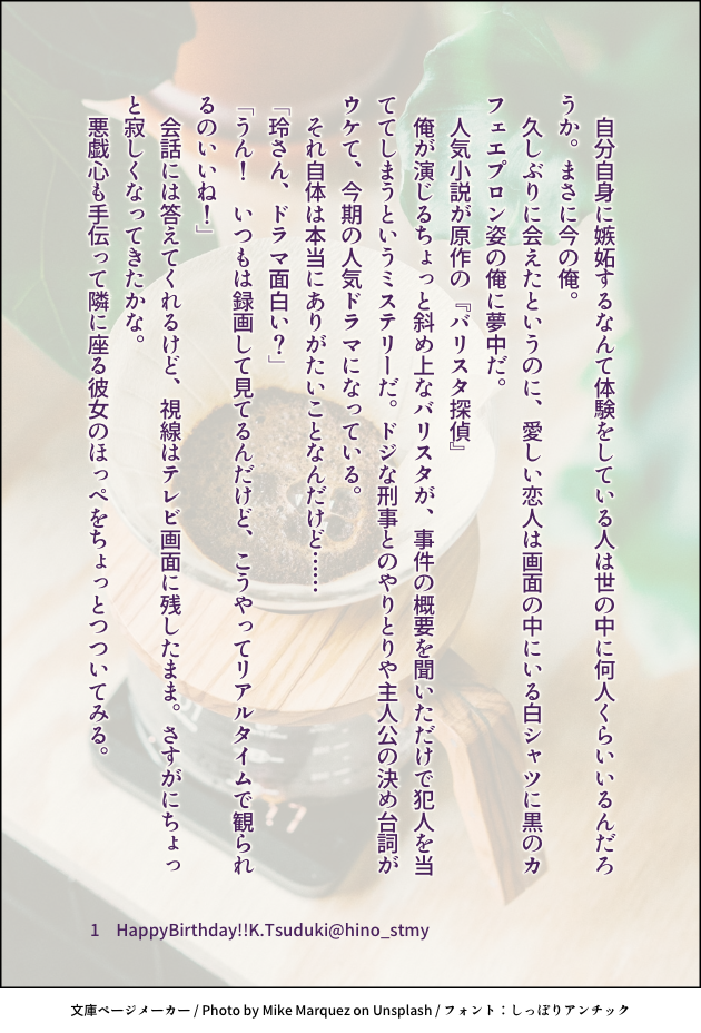 hino_stmy☆quiet followDONE京介くんお誕生日SS僕に夢中なキミと俺/京玲せっかく二人きりになれたのに、キミは画面に夢中で…… #スタマイ stamae #京玲 #都築京介 kyosukeTsuzuki show all(+2 images) Tap to full screen (size:630x928).Repost is prohibited Let's send reactions! freqpopularsnackothersPayment processing Replies from the creator Follow creator you care about!☆quiet follow hino_stmyDOODLE【勝手に妄想してみたを勝手にまとめてみた】twitterでちょこちょこと呟いていたとんでもなく自分本意の妄想が並んでるだけです 6 hino_stmyDOODLE夜を営むヒーローズ(耀玲、カナ玲、菅玲)妄想を促す短文が書きたかった 3 hino_stmyDONE嘘にならない嘘/早乙女→玲⇔瀬尾暗いです。早乙女さんが報われないです。なので、苦手な方はご注意を! hino_stmyDONE耀玲スタマイ勢はみんないい香りがするんじゃないかっていう妄想から書いてしまった hino_stmyDONE桜と恋のキューピッド?/芝玲*芝の日記念SS芝さんのところへやってきた玲ちゃん。何やら相談事があるようで…… 4 hino_stmyDONE京介くんお誕生日SS僕に夢中なキミと俺/京玲せっかく二人きりになれたのに、キミは画面に夢中で…… 3 related works 雨音 鈴DONE桧山さん🎉お誕生日おめでとう!!ギリギリ間に合った~ペン入れはアナログでやってみました。いつも桧山さんの言葉に励まされます。強さとは、温かさであり、優しさ。これからも桧山さんを応援していきたいなぁ。 うめ@眠いPASTお試しで過去絵#スタマイ #宮瀬豪 カヤコDONEstmyイメージお題企画よりお借りしたお題で♡耀玲×2、関玲、渡玲の4話 6 saya_starmoonDOODLEお試しぽいぽい。司玲ちゃん。#スタマイ 小夜の倉庫DONE「Marking」(潔玲)/2018.3.2プライベートでの潔くんの嫉妬台詞があまりにエモかったので。 5 jun_horai0111swDONEフォロワーさんとの企画で、「春」と「ほんわか」のテーマで書いた蒼玲ちゃんです❤素敵なタイトルをフォロワーさんに考えてもらいました~(∩˘ω˘∩ )♡ 4 小夜の倉庫DONE「白に包まれ」(宮玲)/2018.2.19本編未完結の時期に書いたものなので、しんどい感じになっています。 4 小夜の倉庫DONE「恋は人を愚かにする」(誠玲)/2018.1.21誠玲も増やしたい……。 6 jun_horai0111swDONE初書き宏玲初デート(仮)の一幕とでも思って頂ければ|*・ω・) 2 recommended works saya_starmoonDOODLEお試しぽいぽい。司玲ちゃん。#スタマイ もなDONEスタパ、推しが来ません。描いたら出る、描いたら出る………! 小夜の倉庫DONE「秘すれば花なり②」(宮瀬と玲)/2017.12.16 jun_horai0111swDONEツインテールの日九玲ちゃん jun_horai0111swDONE豪華客船潜入イベSS樹玲ちゃん 4 jun_horai0111swDONE勝手にバレンタインSS祭りww渡玲ちゃん 4 jun_horai0111swDONE勝手にバレンタインSS祭りww蒼玲ちゃんフォロワーさんとの合作で1P目はフォロワーさん作❤(掲載許可済)続きを書かせて頂きました。以前上げたのですが、最後のページアップしてなくて( ;∀;)ついさっき気付いたんだけど、追加アップの方法が分からなかったので、上げ直します!見て下さった方、中途半端ですいませんでしたm(_ _)m 5 hino_stmyDONE服部さんお誕生日SS 3 jun_horai0111swDONEフォロワーさんとの企画で、オールマイティな書き出し作ったらどんなお話出来上がるかな?的なやつ❤冒頭一段落がフォロワーさん作です⸜(*ˊᵕˋ* )⸝槙×玲ちゃん 5